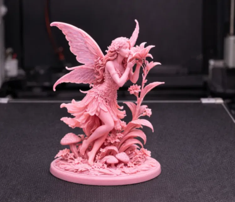 Nàng tiên được điêu khắc tinh xảo, đôi cánh bung nhẹ và nghiêng mình về một đóa hoa ly đang nở. Đế tròn với lá cuộn, hoa nhỏ và nấm rừng tạo bố cục thanh thoát nhưng vững, rất hợp in 3D độ phân giải cao.
