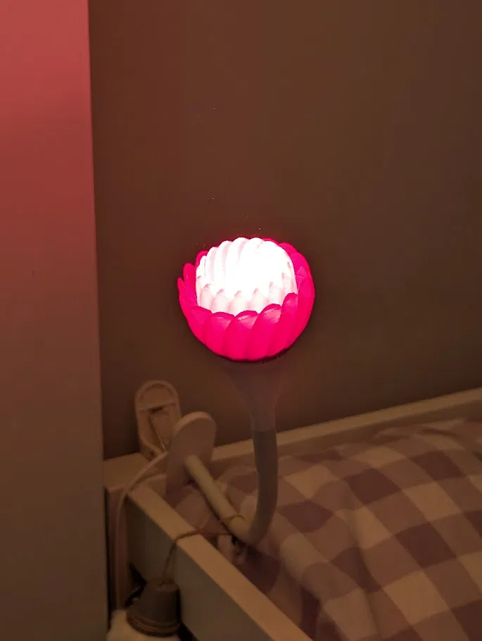 Chụp đèn hình bông hoa cho đèn kẹp IKEA Navlinge, giúp làm dịu ánh sáng đèn đầu giường cho bé. Fit rất khít nên có thể cần hơ ấm nhẹ khi lắp; nên in kèm raft, không cần supports nhưng dọn bên trong chút.