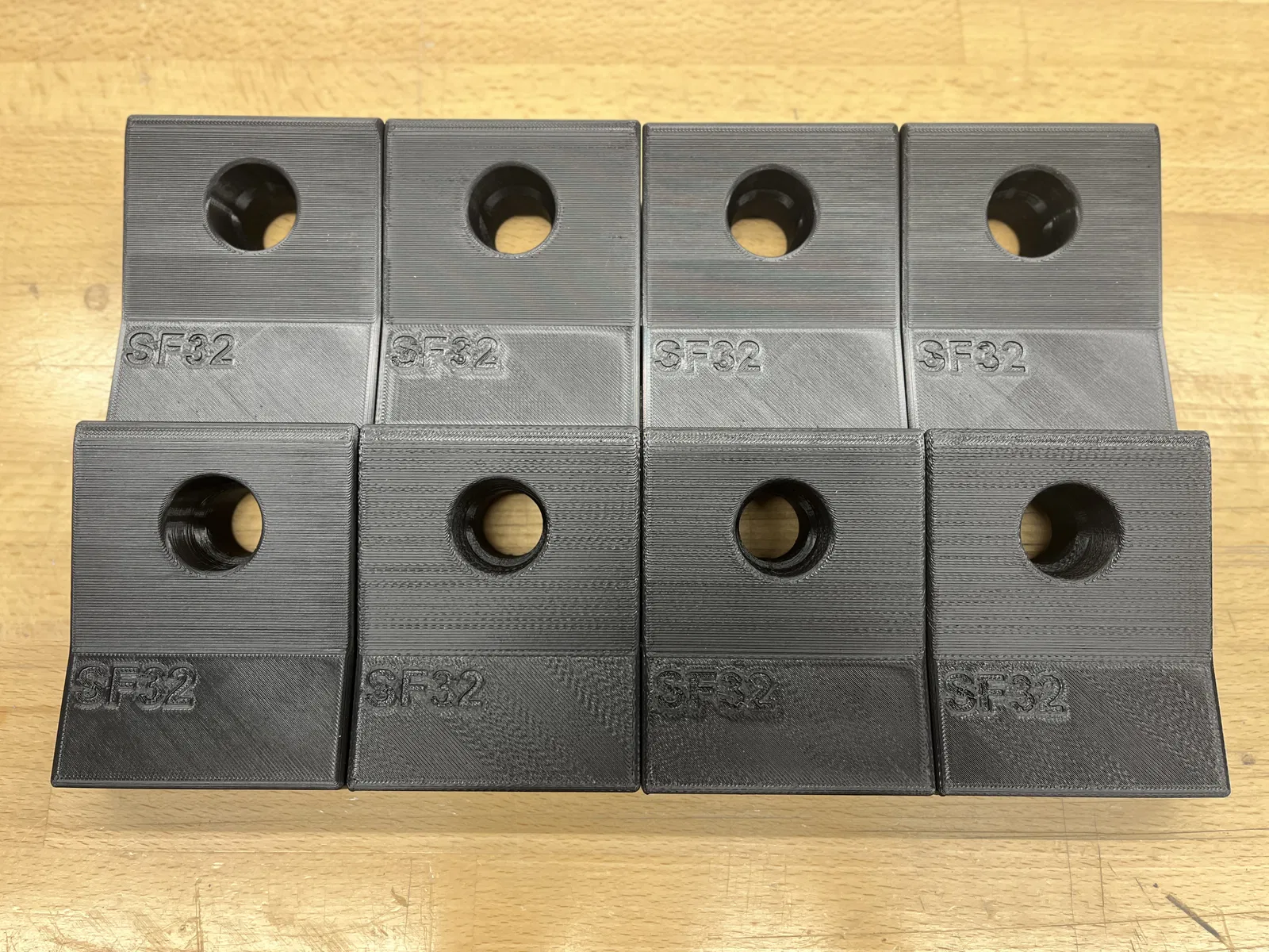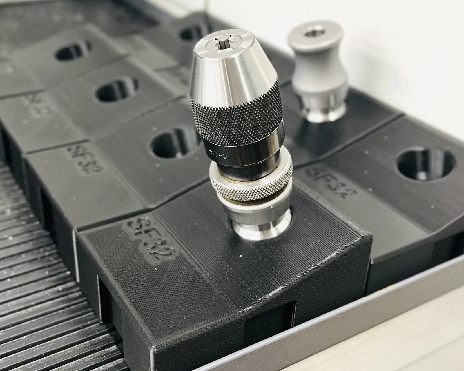 Giá đỡ trục khoan Fehlmann SF32 dạng modular, góc đặt ergonomic và chừa khoảng trống để thao tác dễ. Các module kẹp nối được và có 4 lỗ 4mm phía sau để bắt vít. Nếu dovetail lệch, hãy scale lại.