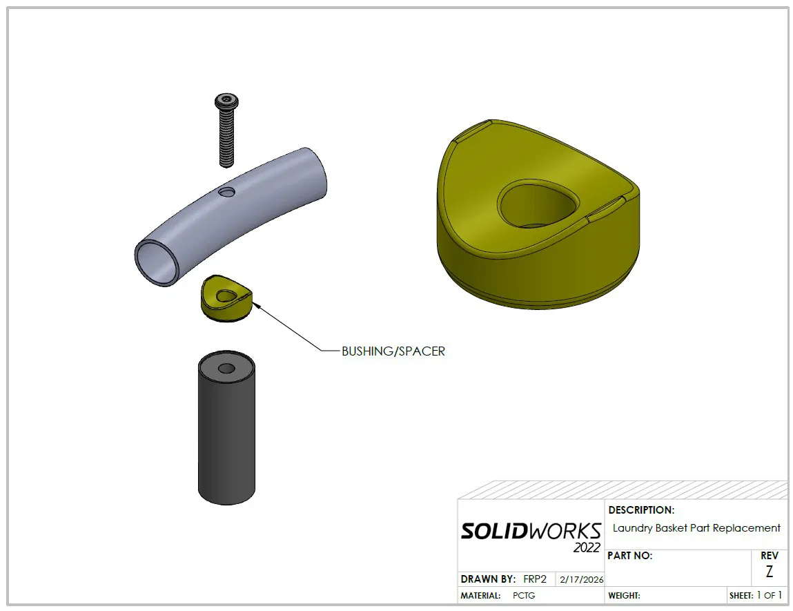 Mình mua (2) giỏ đồ dơ SONGMICS 18.5-Gallon (70 L) Laundry Basket và có một cái bị thiếu cái bushing để đỡ phần siết cố định các thanh kim loại. (Xem hình bên dưới) Mình đã chỉnh lại chiều cao của bushing/spacer (DFM tối ưu cho in FDM nozzle .4 mm) nên bạn sẽ cần in (4) cái; nó sẽ khác với bushing/spacer OEM.