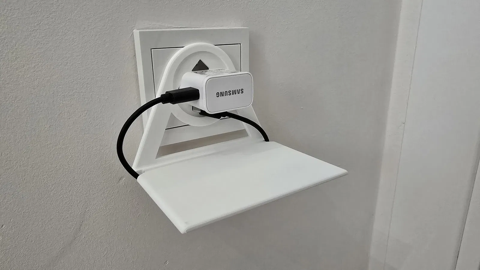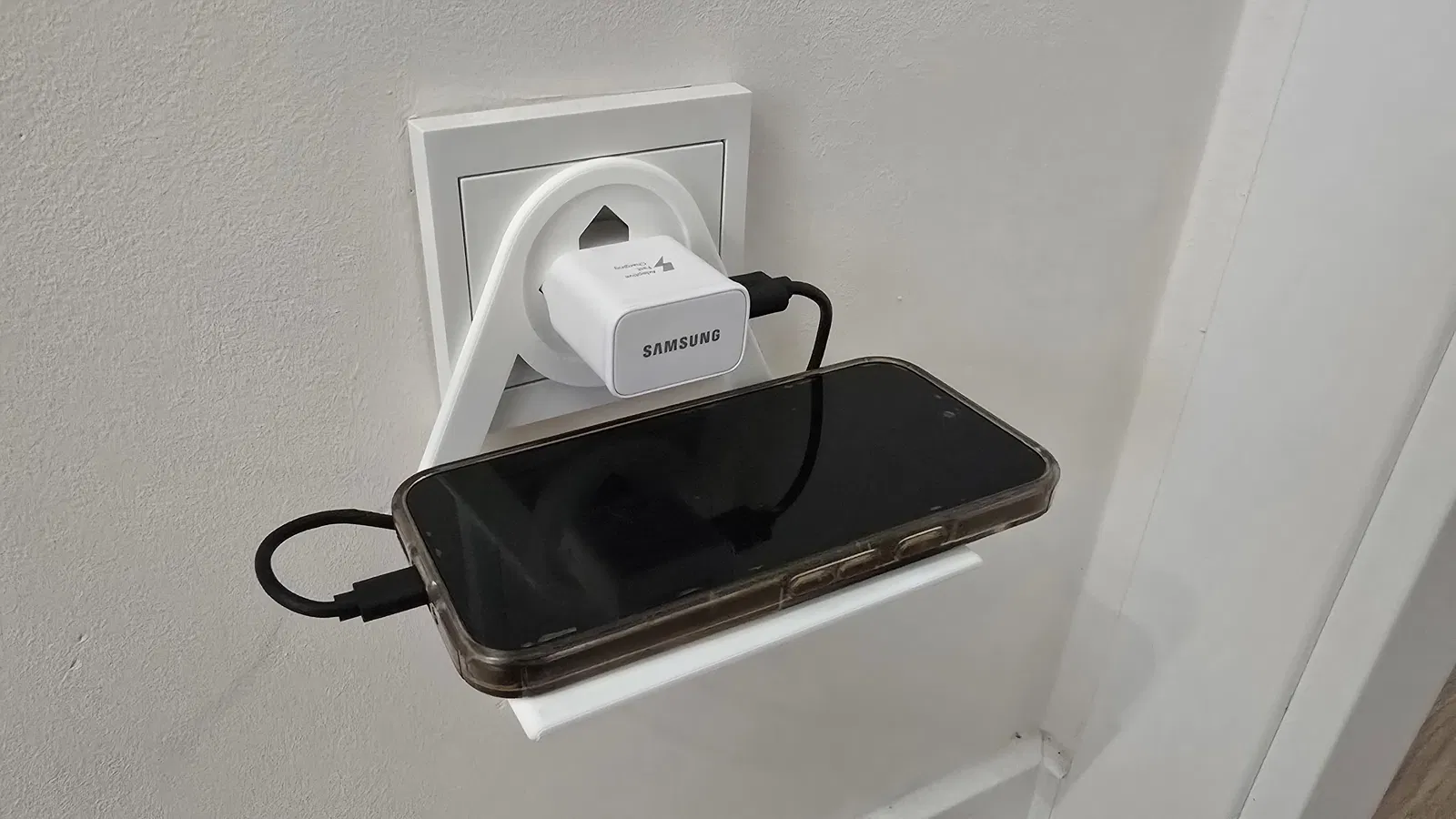Một cái giá đỡ để sạc điện thoại trong lúc vẫn cắm trực tiếp vào ổ điện.