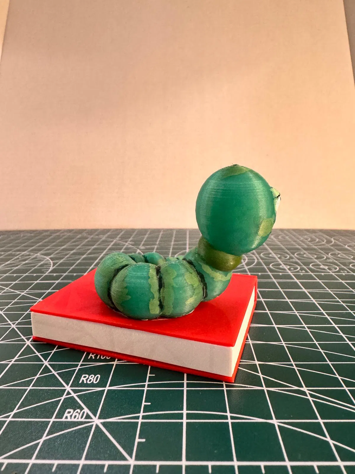 Thiết kế được giữ cố ý đơn giản và vững – rất phù hợp cho 3D-Druck. Chú sâu gồm các khối mềm, chia đốt và hơi nghiêng người về phía trước trên quyển sách. Quyển sách đồng thời đóng vai trò làm bệ chắc chắn, giúp đứng vững an toàn.