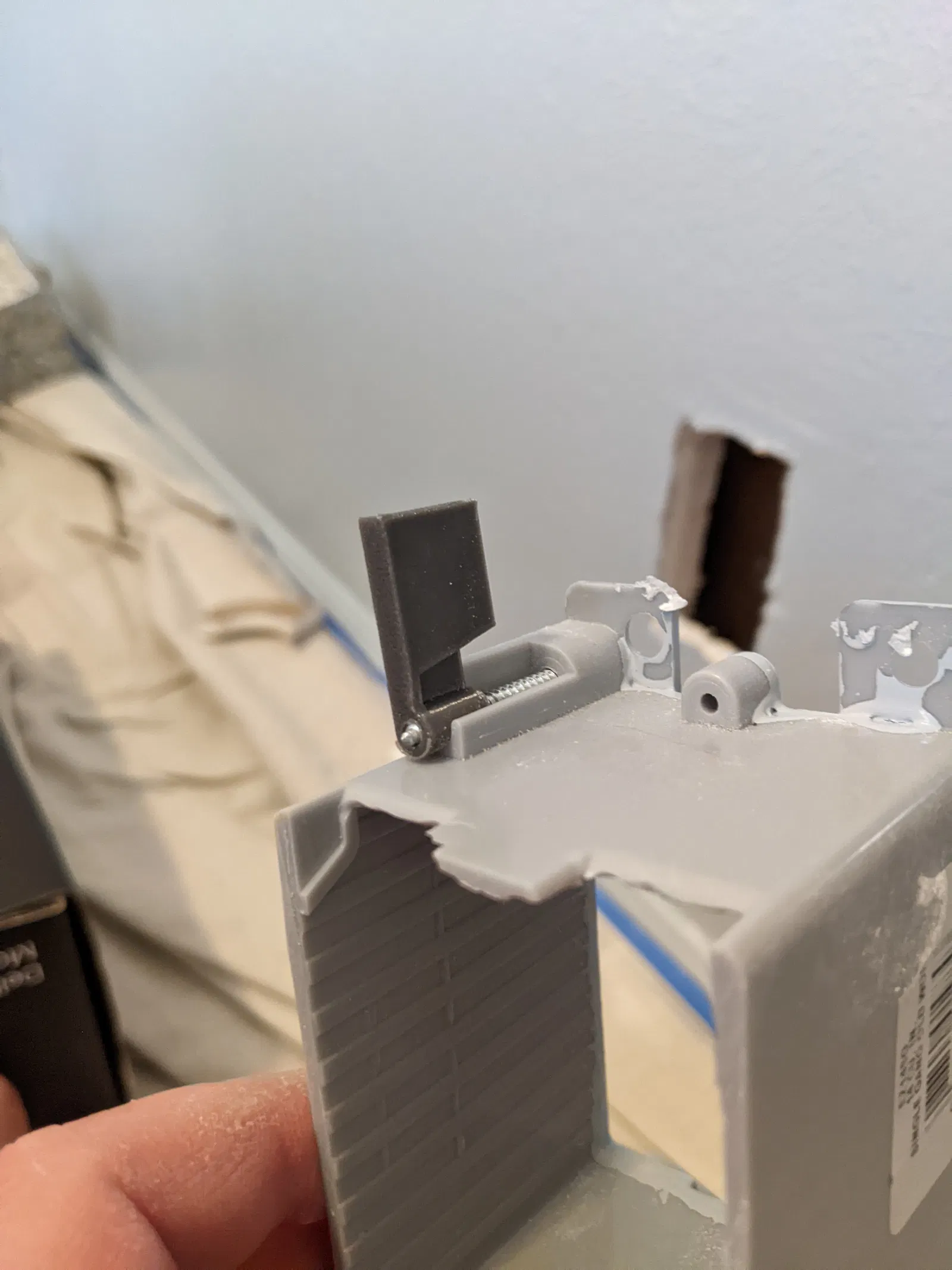 Mình đang gắn một gang box lên tường để đi CAT6 và trong lúc cố lắp cái box vào trong tường thì cái locking flap trên box tự nhiên bị tuột ra rồi rơi tọt vô trong vách. Mình không cách nào lấy lại được nên đành thiết kế và in một cái thay thế.