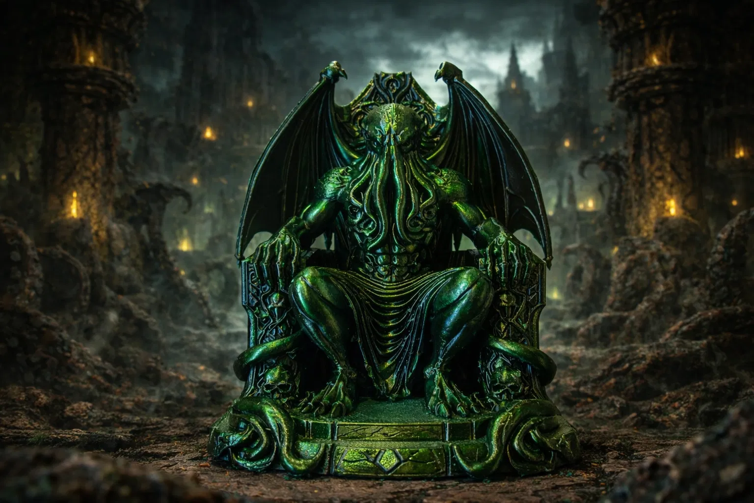 Mẫu tượng Cthulhu ngồi trên chiếc ngai cyclopean đồ sộ, lấy cảm hứng từ cosmic horror của H. P. Lovecraft. Bố cục nhấn vào sự hiện diện, khối lớn và silhouette rõ ràng, rất hợp để trưng bày hoặc đặt bàn làm việc.