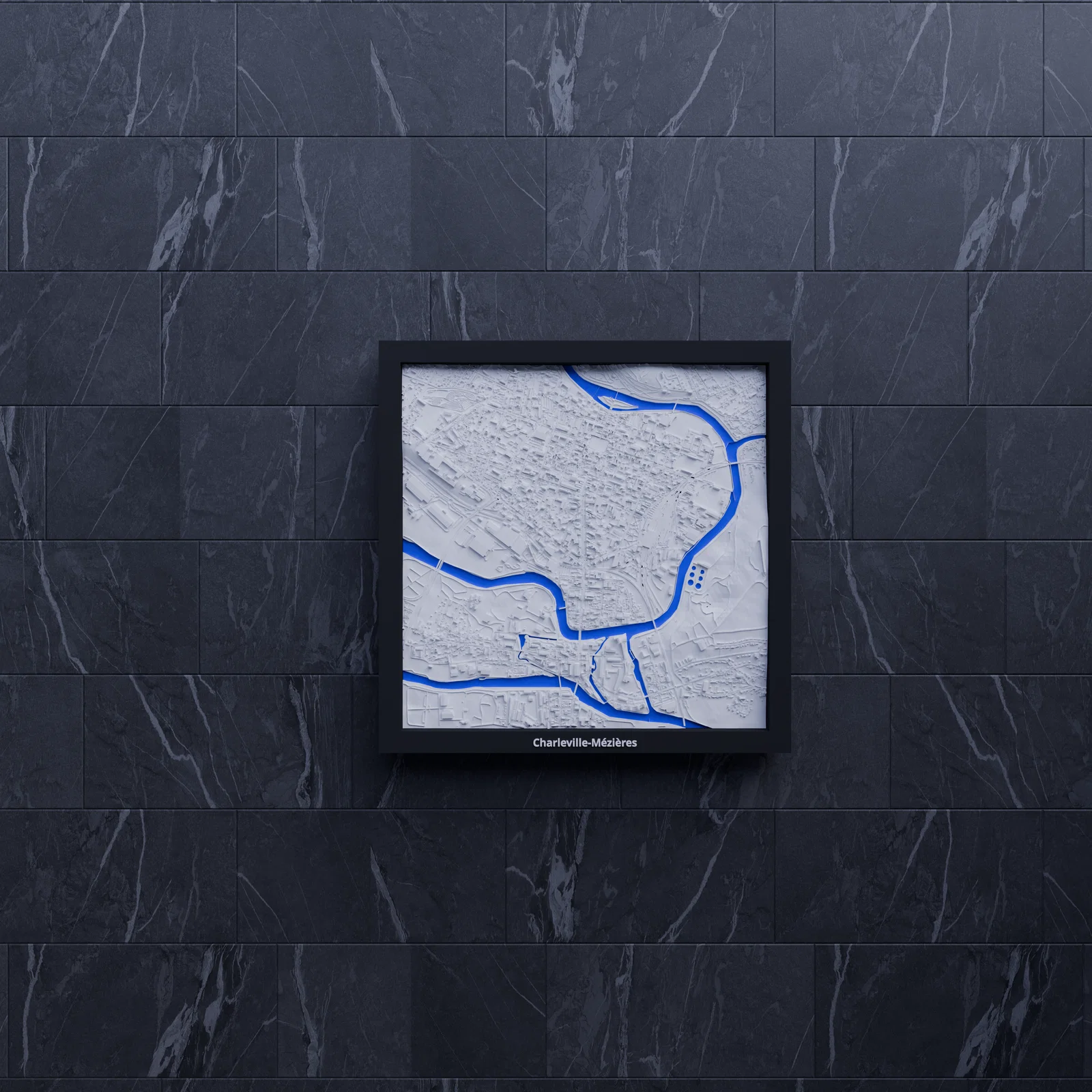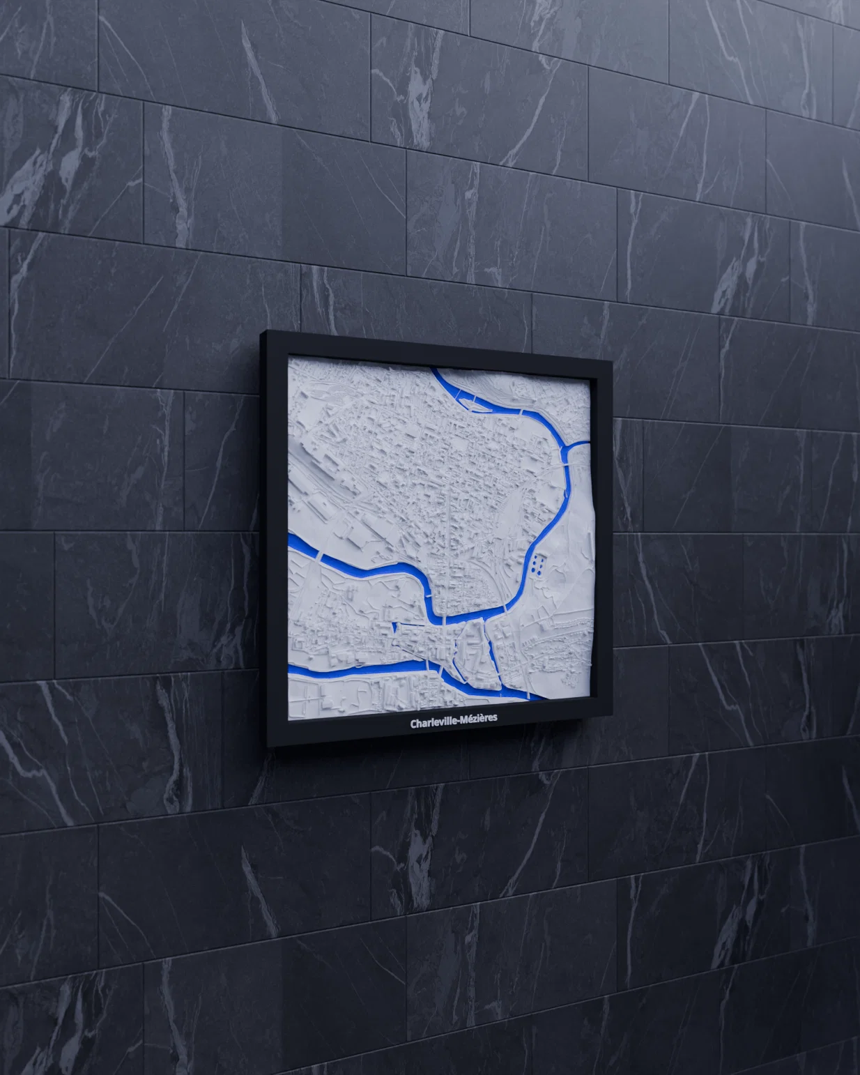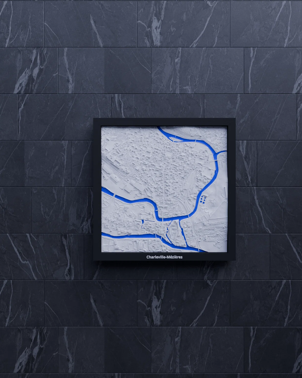 Mô hình địa hình thu nhỏ 3D của Charleville-Mézières (Pháp), dựng từ dữ liệu địa lý để thể hiện địa hình chân thực. Có sẵn file STL/3MF và nhiều phiên bản khung treo, phù hợp trưng bày, học tập hoặc làm quà.