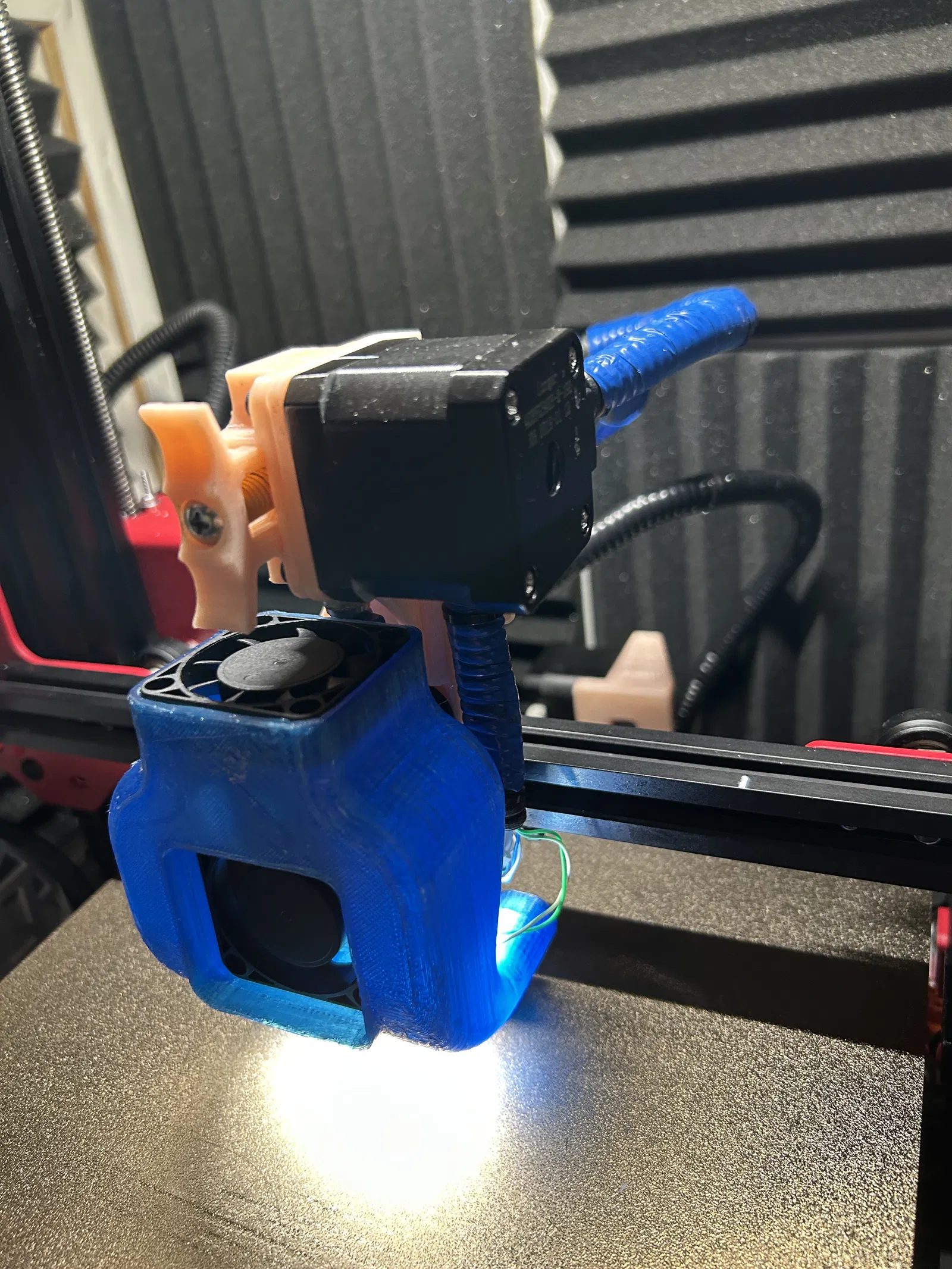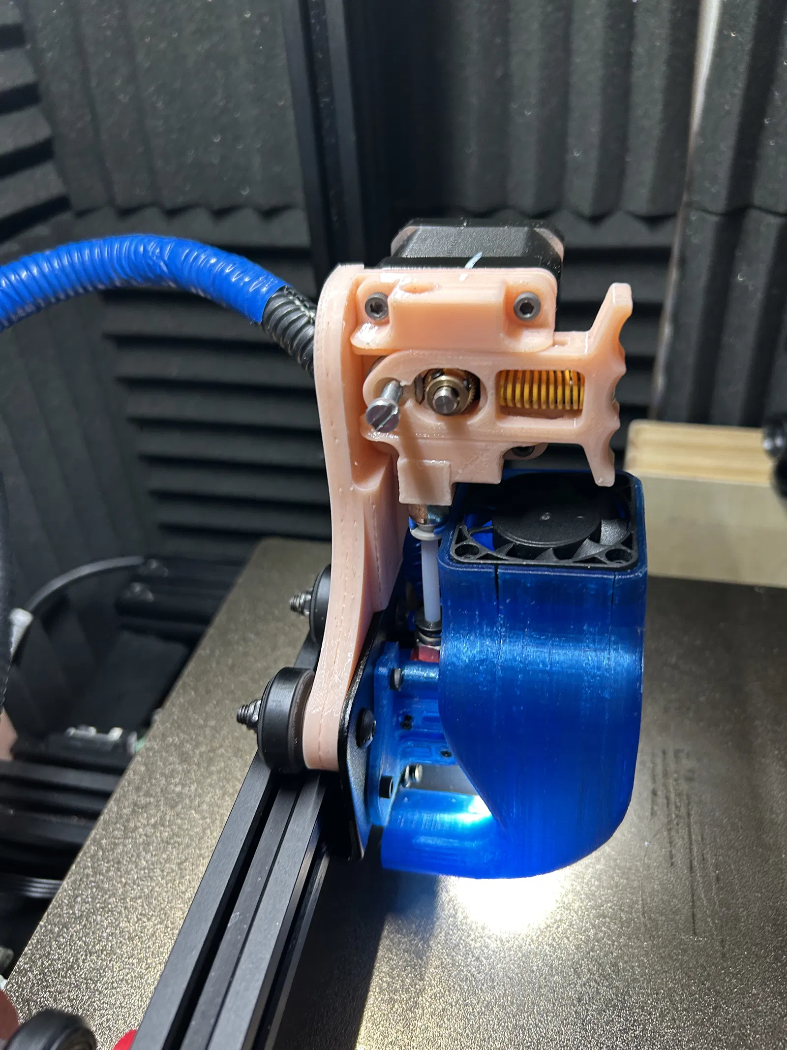 Máy in trong hình là Alfawise U30 gắn X Carriage của Ender 3, dùng cooling duct ADKS và More Efficient Extruder như trong ảnh. Extruder Ender 3 nguyên bản cũng sẽ dùng được mà không gặp vấn đề gì.