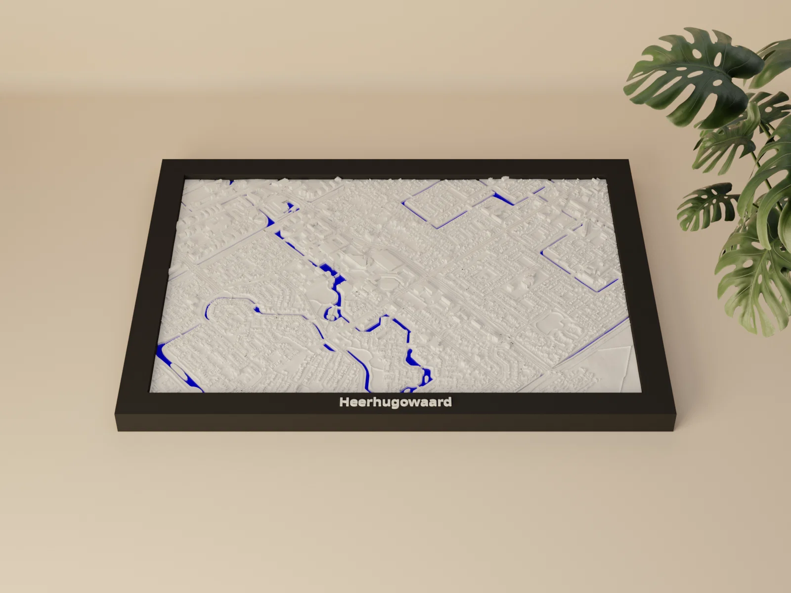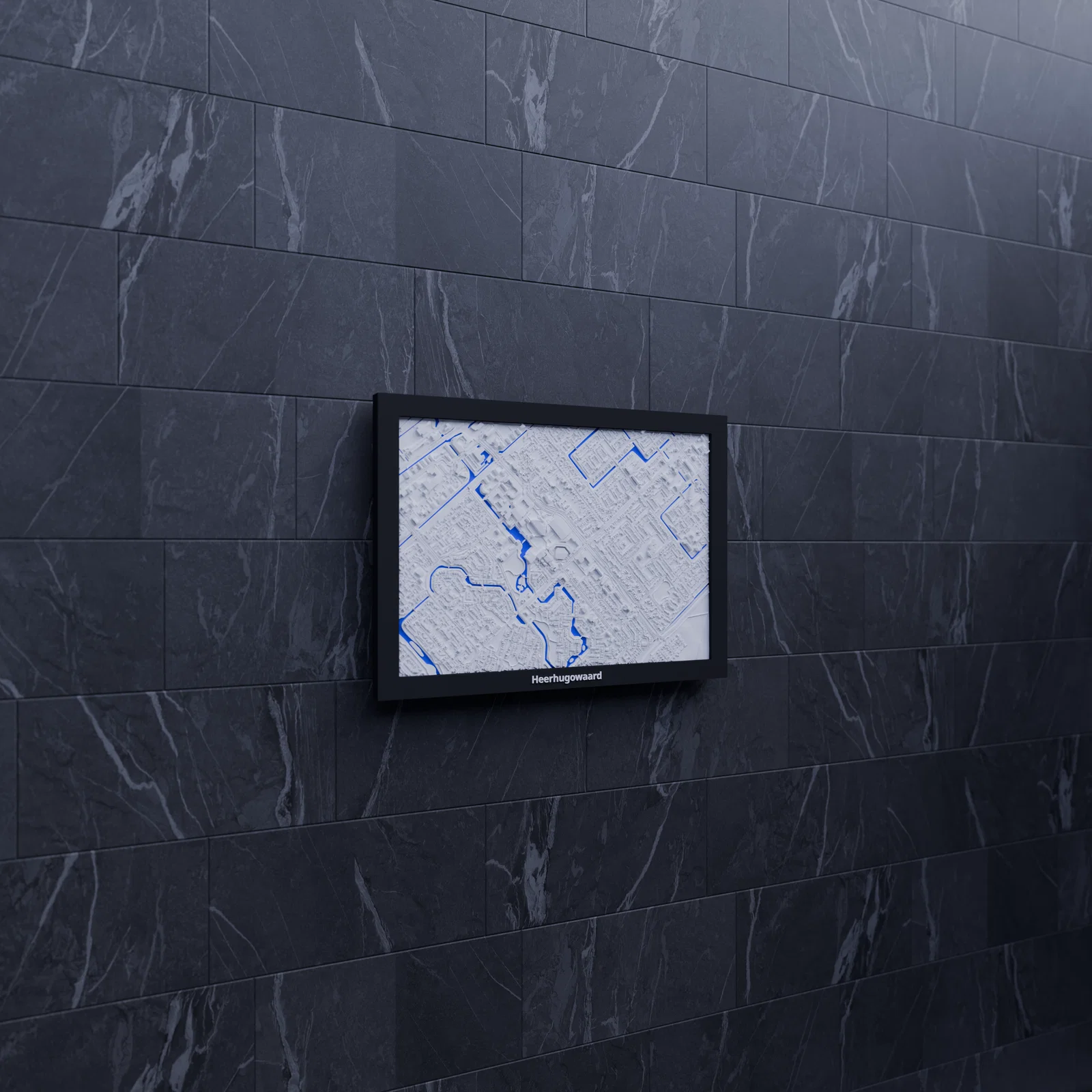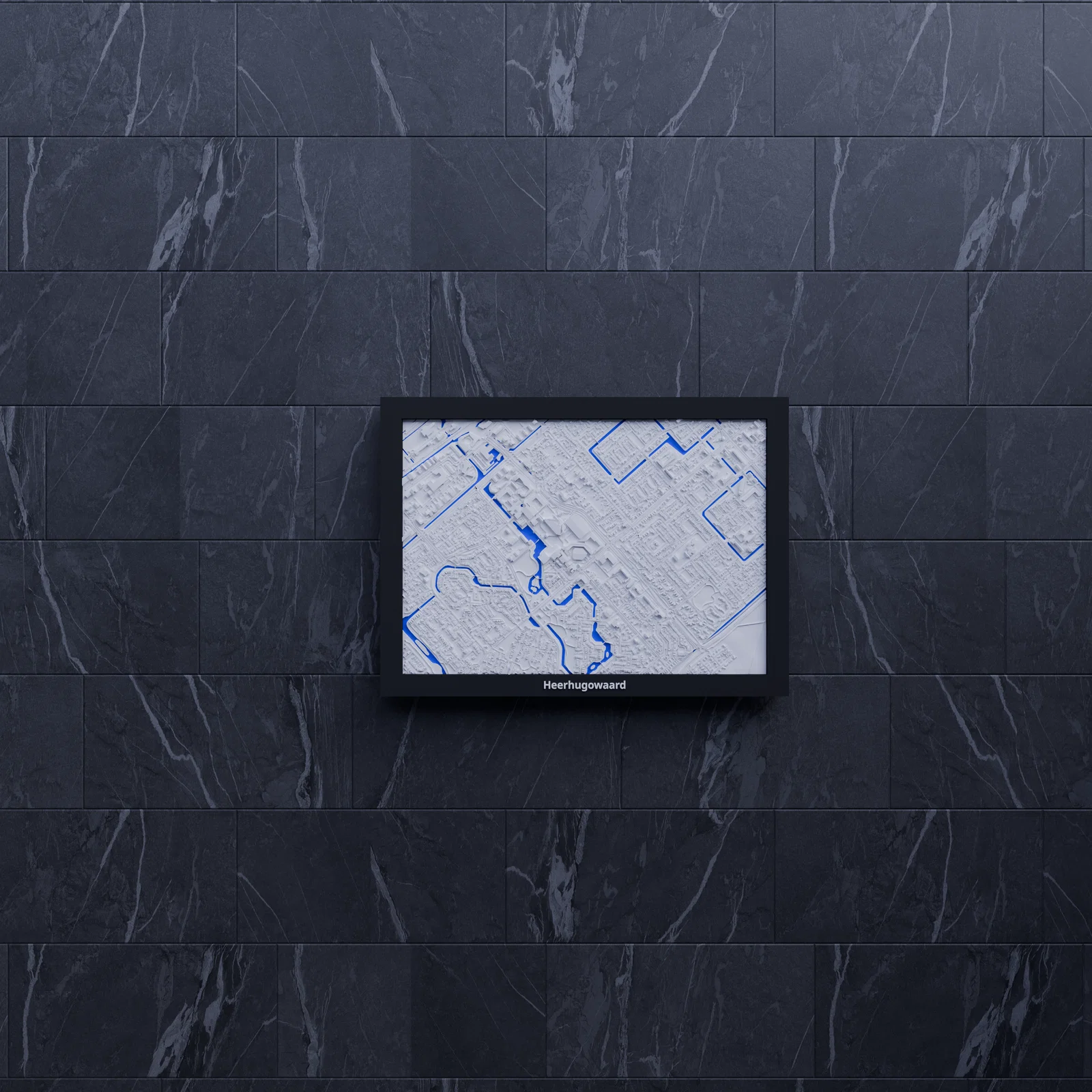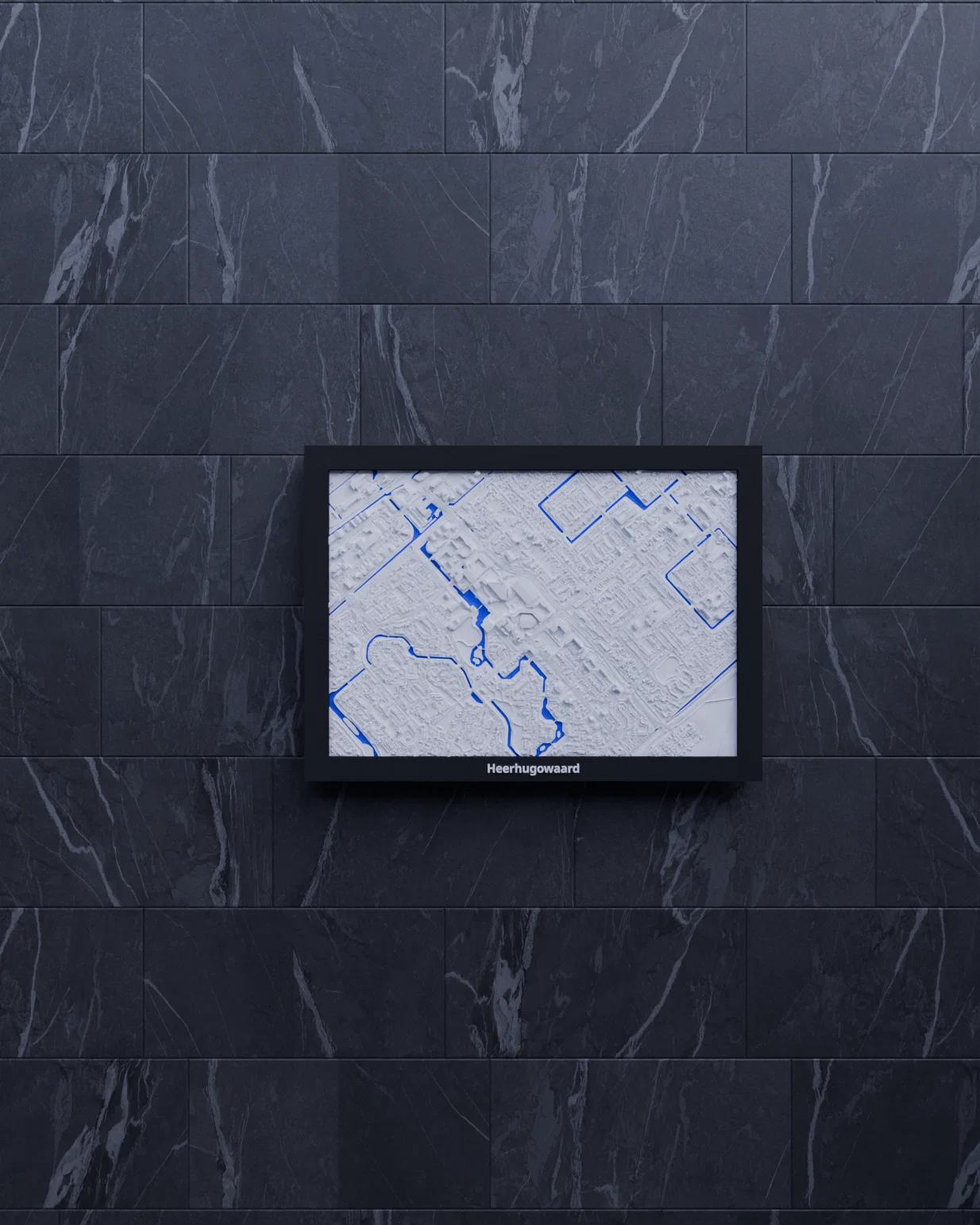 Mô hình topographic miniature 3D tái hiện cảnh quan Heerhugowaard (Hà Lan), thu nhỏ từ khu vực 2.051 x 1.433 km xuống 170.5 x 119.5 mm (~12027:1). Có sẵn STL và 3MF kèm khung treo.