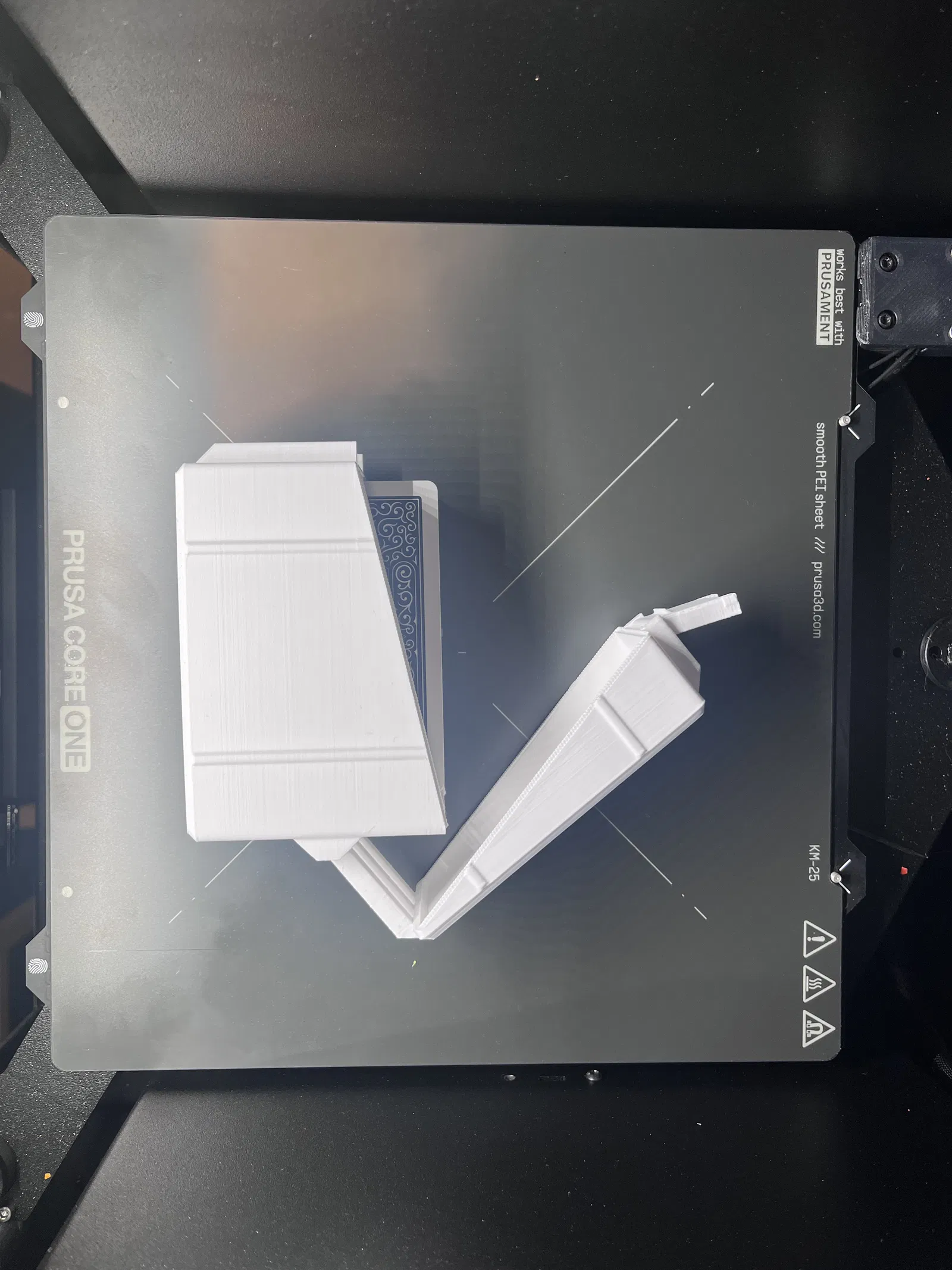 Hộp print in place để cất 2 bộ bài tiêu chuẩn. Bản lề cần độ bám lớp tốt nên khuyến nghị PETG. Đã test dung sai trên Prusa Core One, in xong lấy khỏi build plate là dùng ngay.