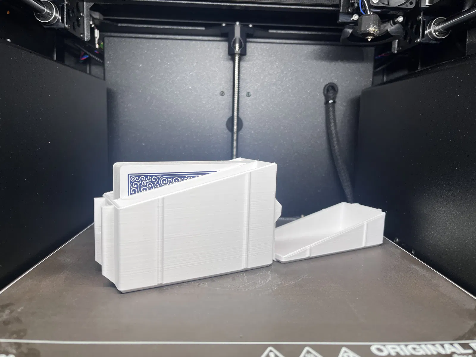 Hộp print in place này được thiết kế để đựng hai bộ bài tiêu chuẩn. Phần bản lề cần vật liệu có độ bám lớp (layer bonding) tốt, nên khuyến nghị dùng PETG.