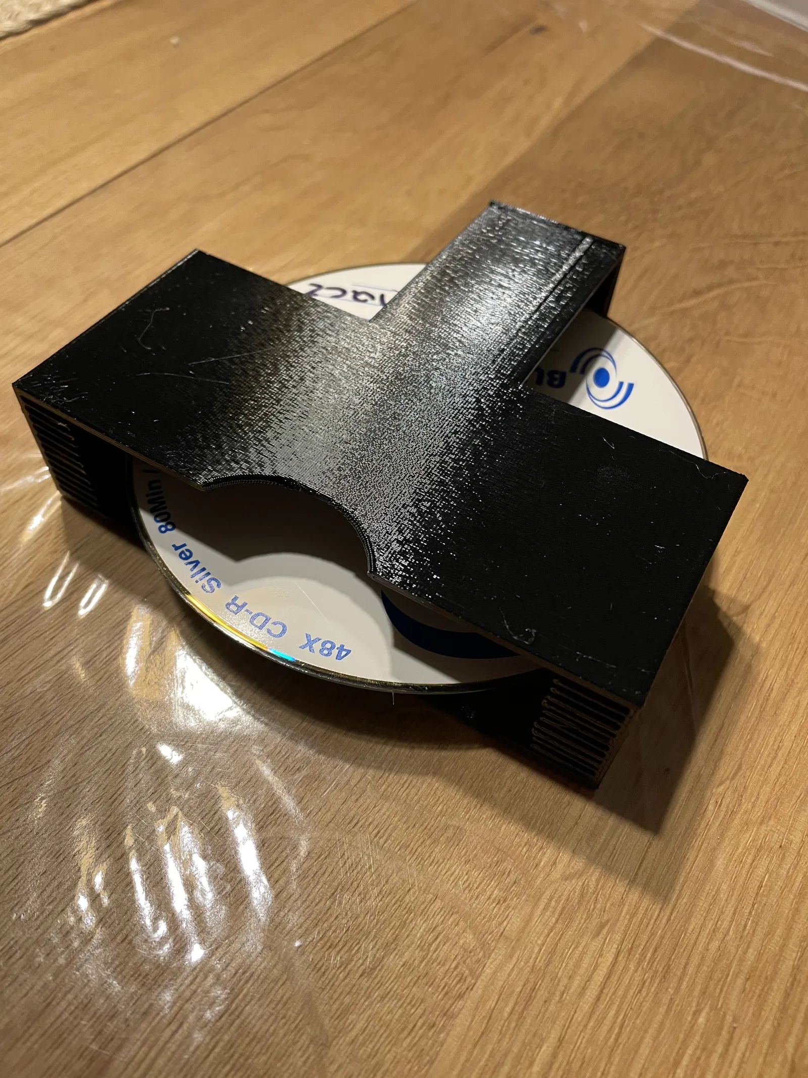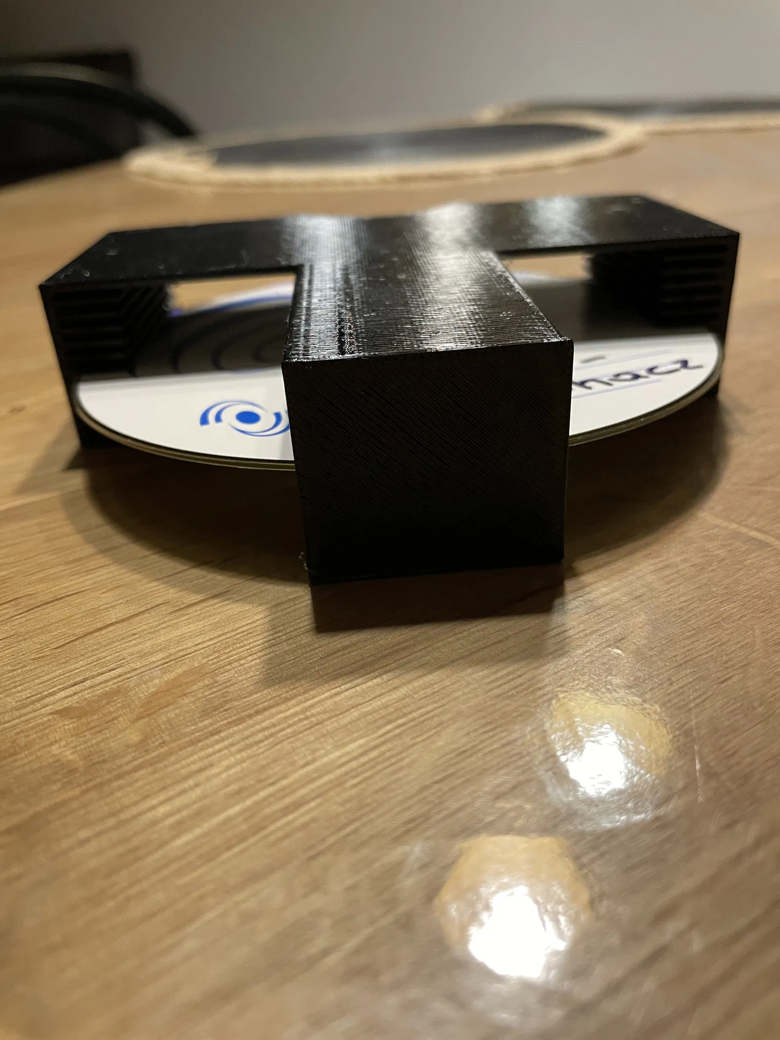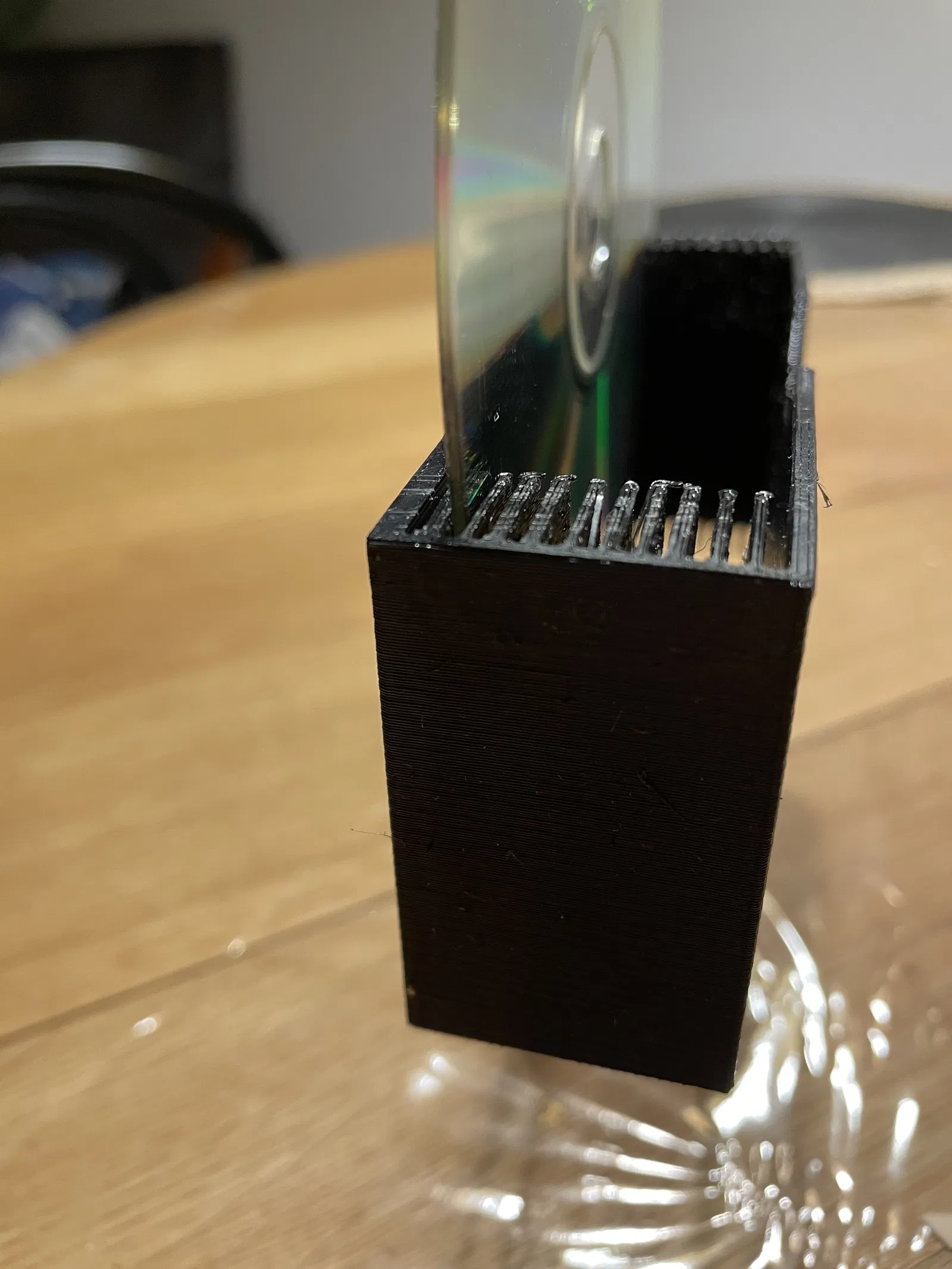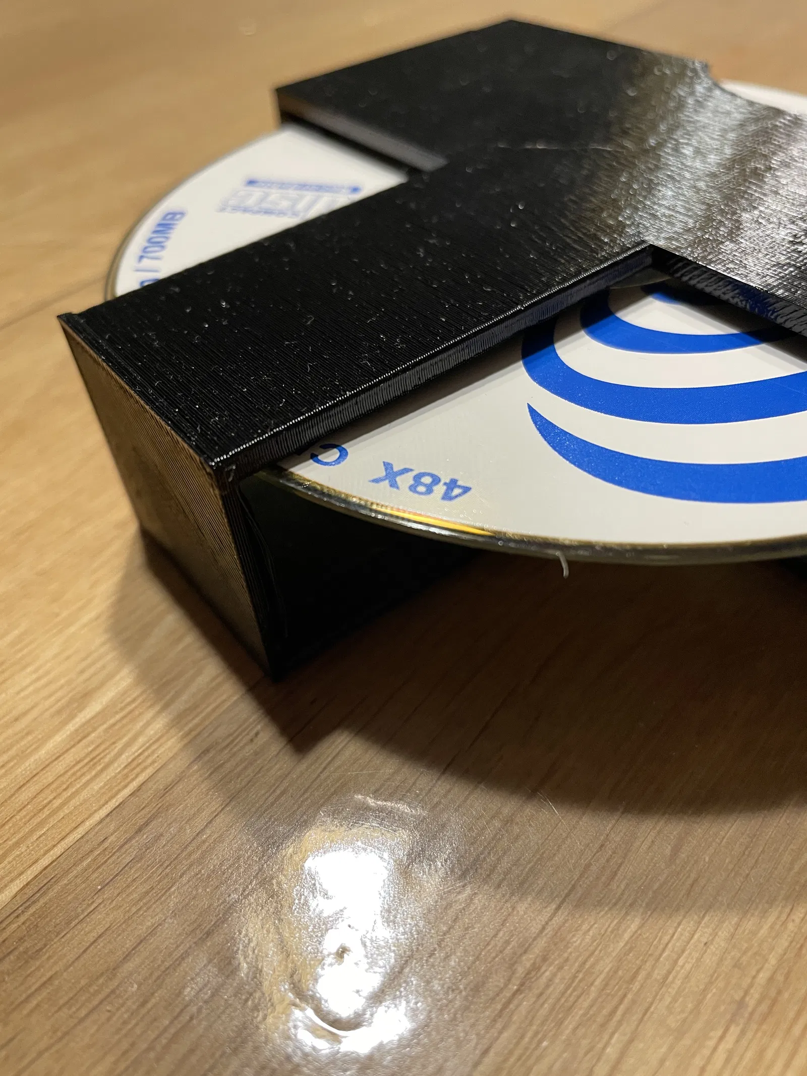 Giá đỡ/kệ lưu trữ CD nhỏ gọn chứa 11 đĩa, dùng tốt trên bàn làm việc hoặc trong hộc để đồ xe để tránh trượt và giảm tiếng ồn. Có thể in nhiều cái để nối modular; dùng băng keo hai mặt để cố định.