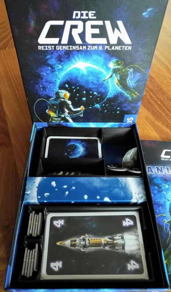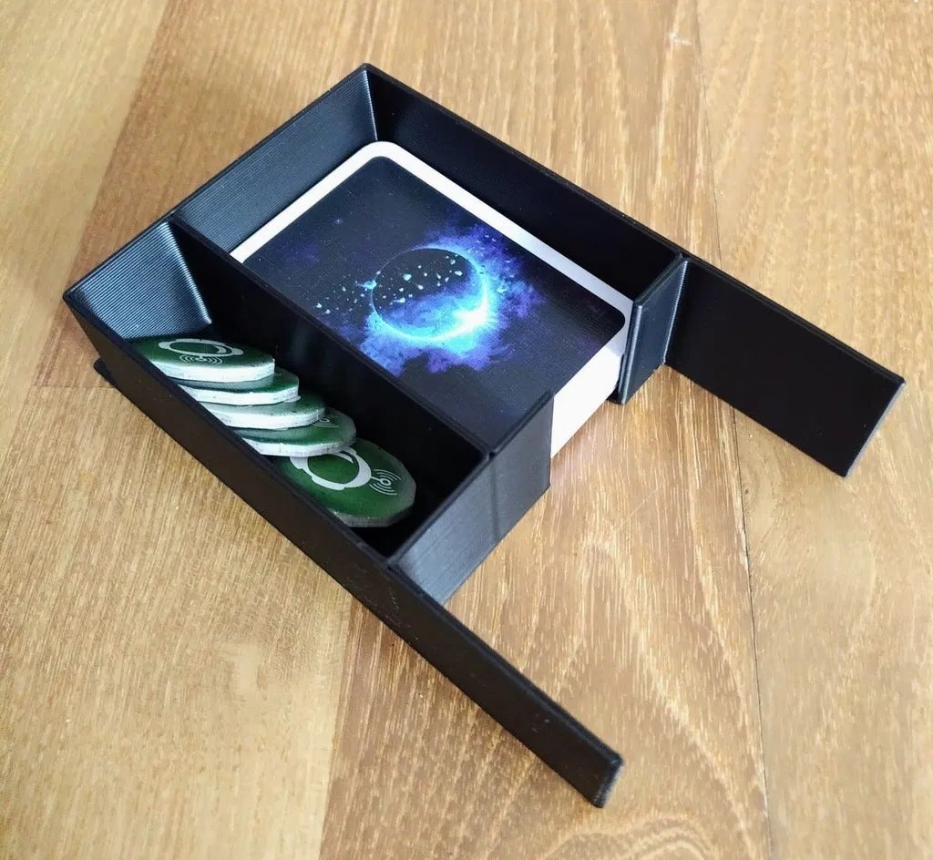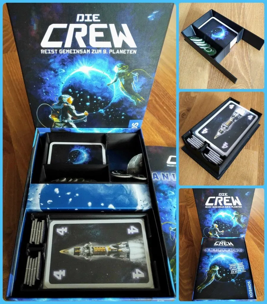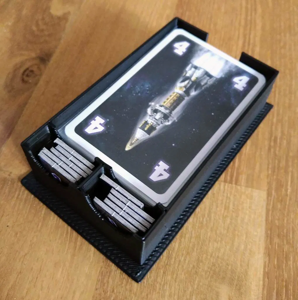 Inlay/organizer nhỏ cho board game The Crew / Die Crew, thiết kế để vẫn dùng được khay carton gốc và tương thích với bài đã bọc sleeve. In mỗi hộp 1 cái, nozzle 0.8mm, layer 0.6mm, tầm 1,5 giờ.