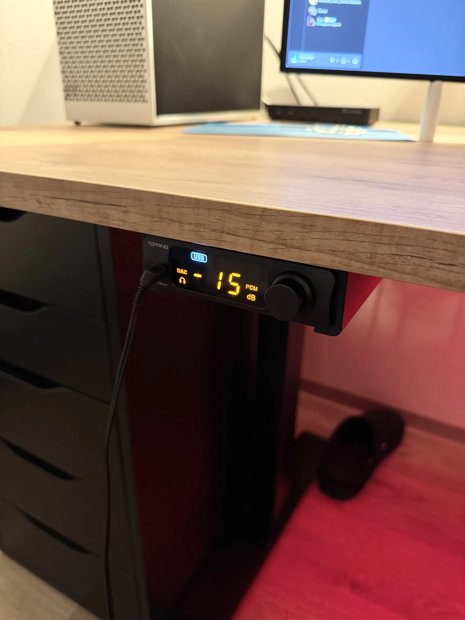 Giá đỡ Topping DX3 Pro lắp dưới mặt bàn, có thể cố định bằng vít gỗ hoặc băng keo. Chỉ cần trượt máy từ phía trước vào tới khi khít; thiết kế chừa khoảng để chân đế không bị cấn.