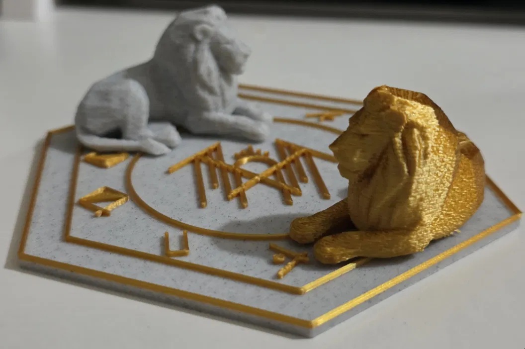 In trên CC2. Có thể in 1 màu hoặc thêm pause ở bước 10 rồi đổi filament. Marble + gold nhìn nổi bật, nhưng cũng có thể hợp với các combo màu khác như Dark Green và Gold. (Mấy con sư tử là từ một bản in khác cho đẹp thôi, tên Low poly crouching lion, không thuộc thiết kế này.)