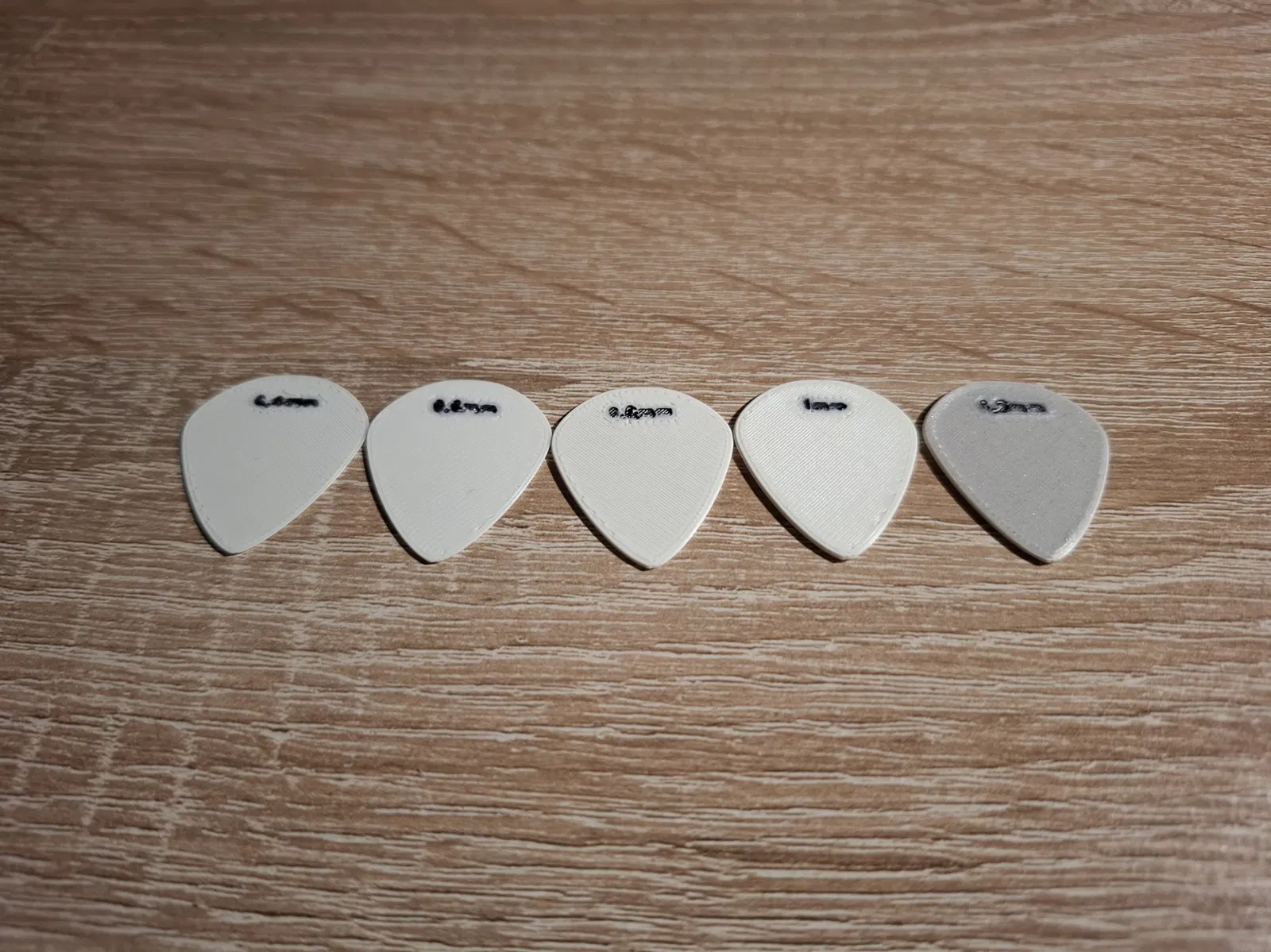 Trsátka (miếng gảy đàn guitar) với nhiều độ dày khác nhau từ 0,4mm đến 1,2mm. Lý tưởng là in hết tất cả rồi thử để chọn cái hợp tay nhất. Mình khuyên dùng tính năng ironing để bề mặt mịn đẹp nhất.