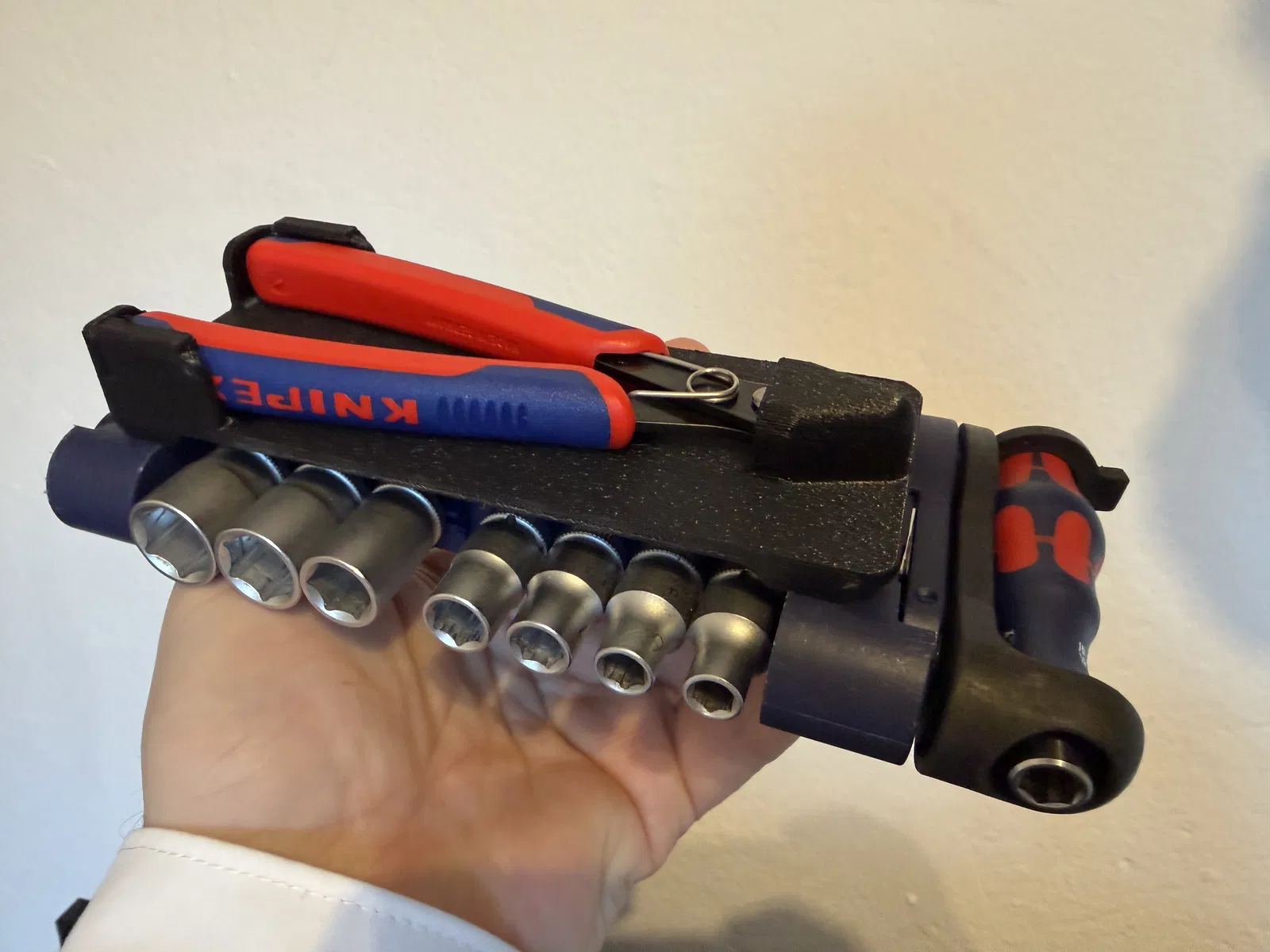 Giá đỡ để gắn kìm cắt Knipex vào Wera Tool-Check, bấm khớp chắc chắn nhờ rãnh của belt holder. Khuyến nghị in bằng PETG hoặc Flex cứng; lắp kìm với mũi chĩa xuống.