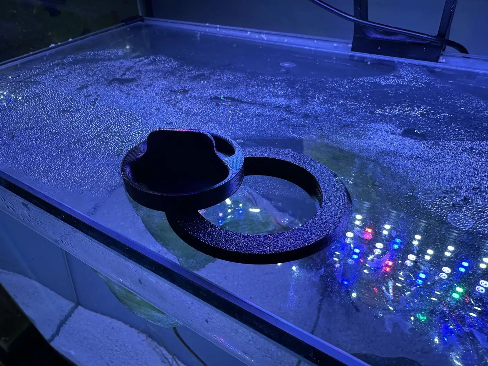 Cổng cho ăn dạng tròn cho nắp polycarbonate: chỉ cần khoan lỗ 2" ở phần trước, giữa nắp rồi gắn vào. Gợi ý in rim 4 walls, plug 2 walls và infill cao để lỡ rớt xuống hồ vẫn nổi.