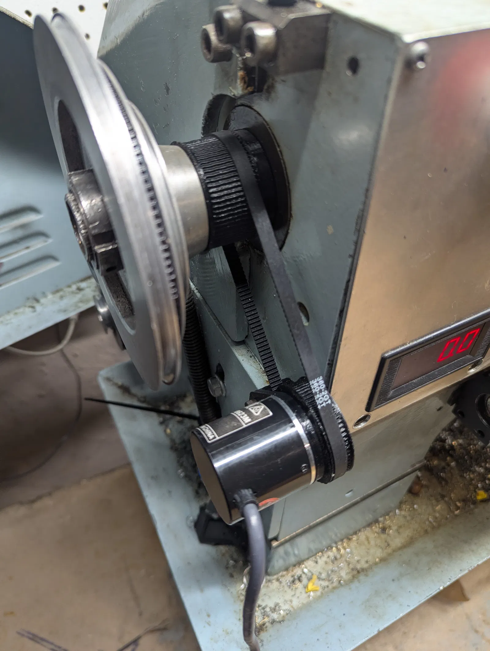 Với bản in bracket, bạn sẽ cần khoan và ta-rô để bắt bulông M5 vào thân máy tiện. Dùng dây belt để canh vị trí bracket cho hợp lý. Nhớ kiểm tra khoảng hở với các pulley của spindle. Khoan và taro lỗ đầu tiên tại điểm pivot chính, sau đó khoan thêm một lỗ gần giữa rãnh slot. Bạn KHÔNG cần căng belt nhiều, chỉ đủ để răng ăn khớp; mục đích duy nhất của belt là quay encoder đồng bộ với spindle.