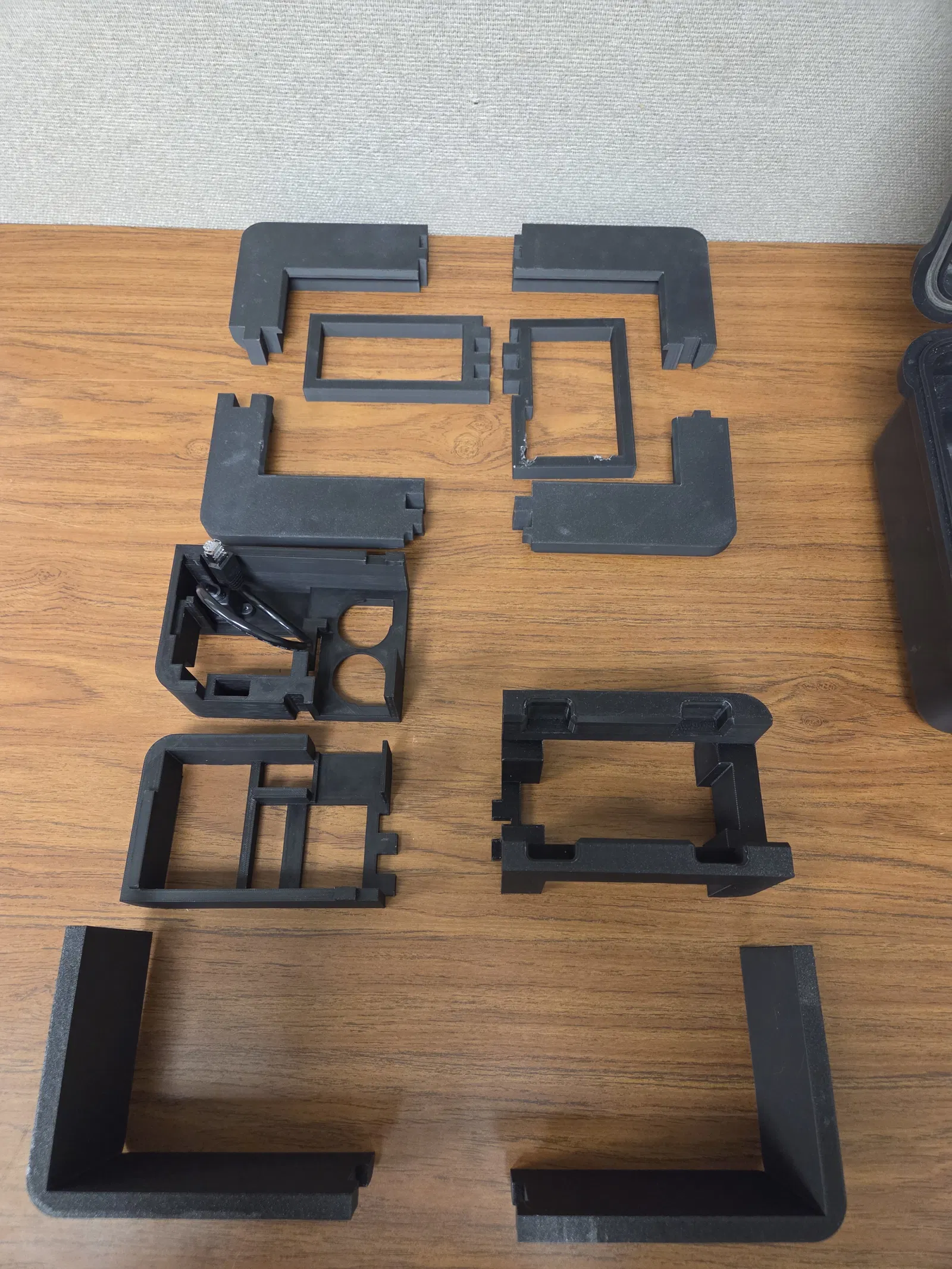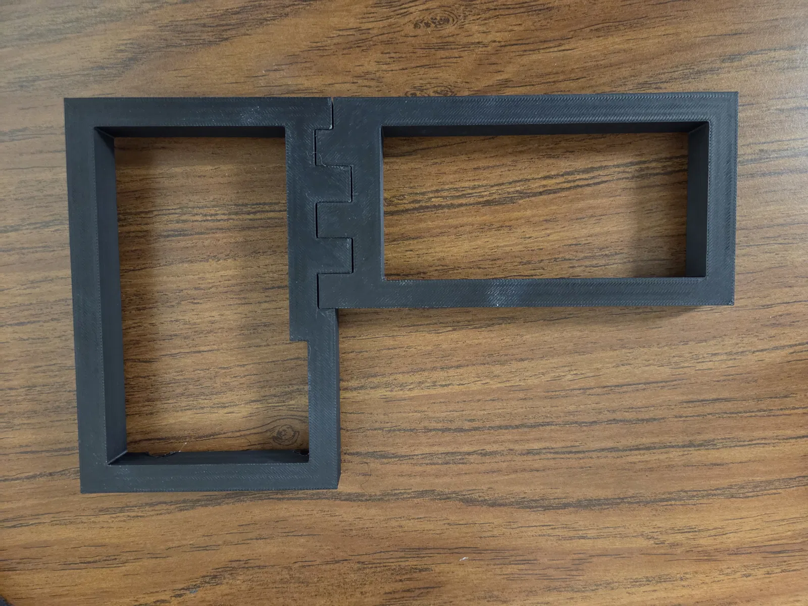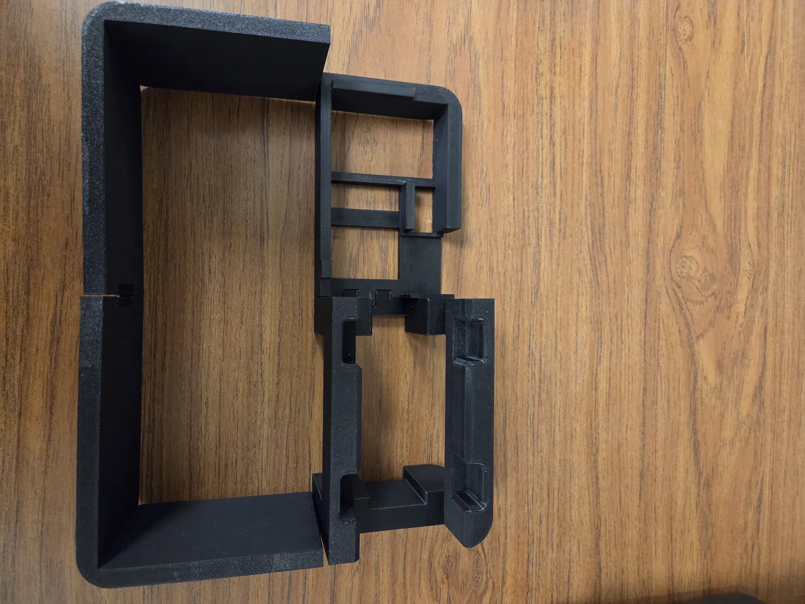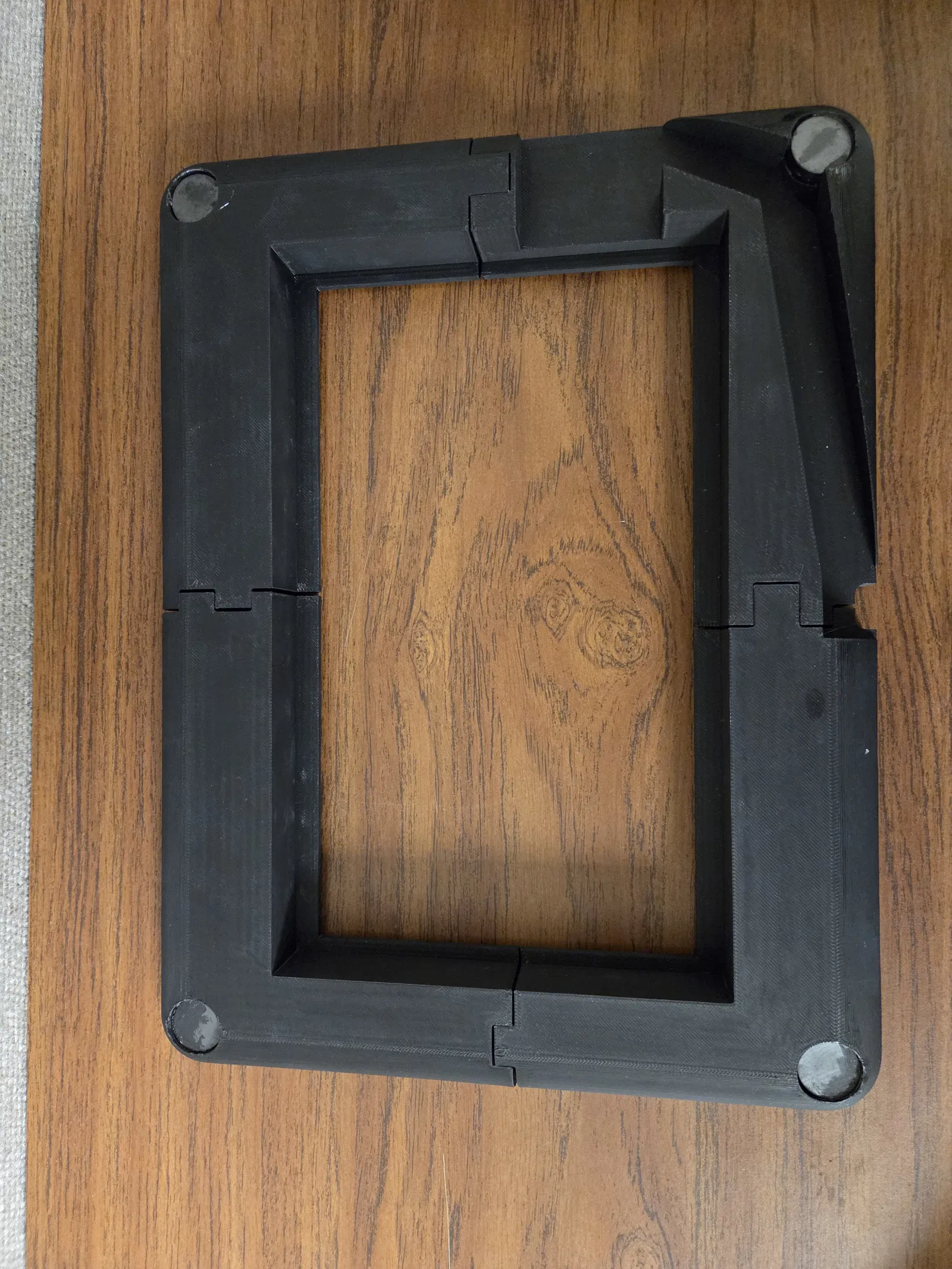 Các chi tiết này khóa với nhau bằng ngàm và khe (tabs & slots) tích hợp, tạo thành khung viền cứng bao quanh màn hình.