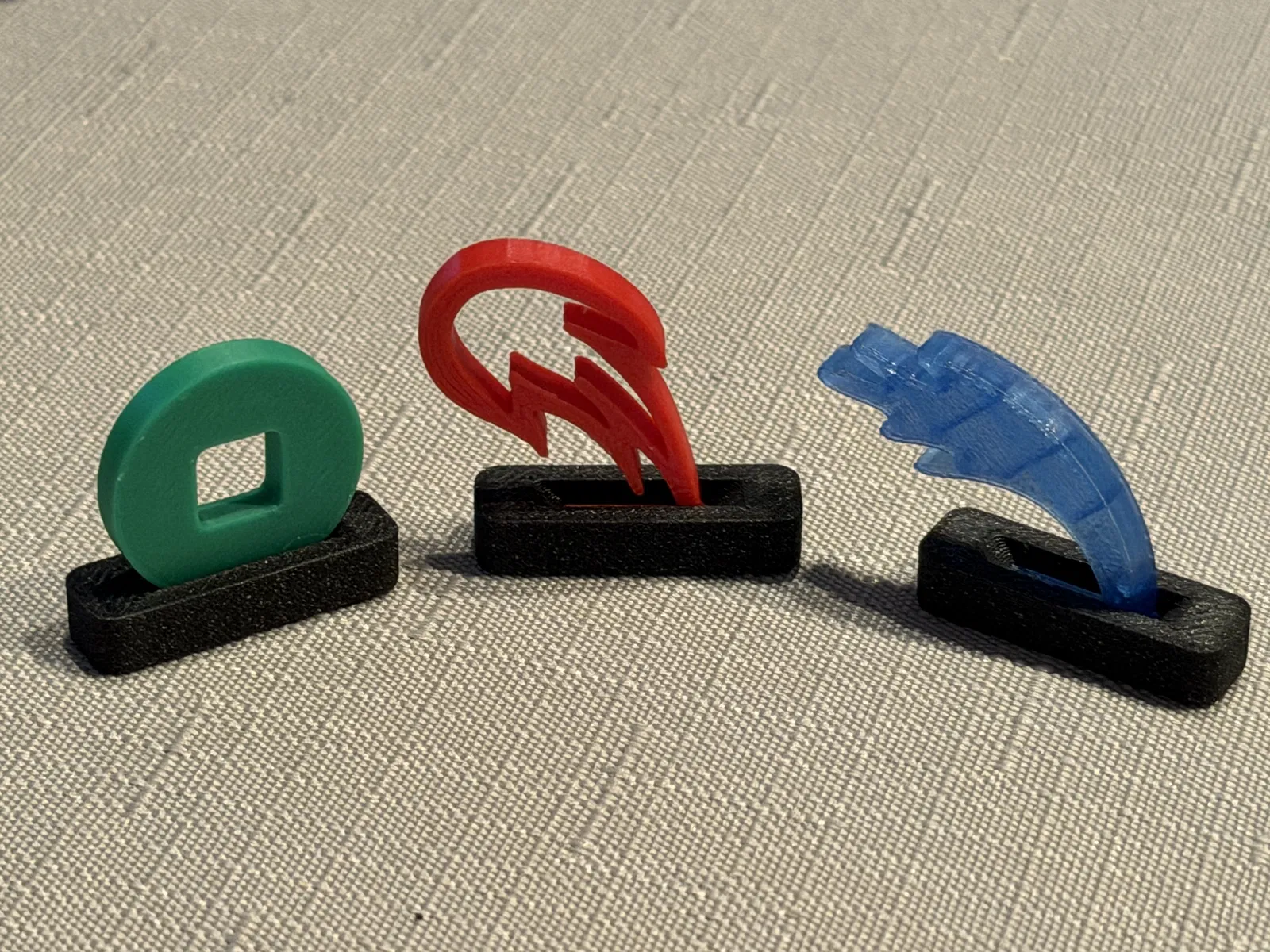 Token zin của board game Legend of Korra: Pro-Bending Arena nhìn chưa đẹp nên mình làm bộ token mới cho trực quan hơn. Mỗi loại in khoảng 10 cái là đủ; đế tension fit nên không cần keo. In layer 0.2, standard settings.