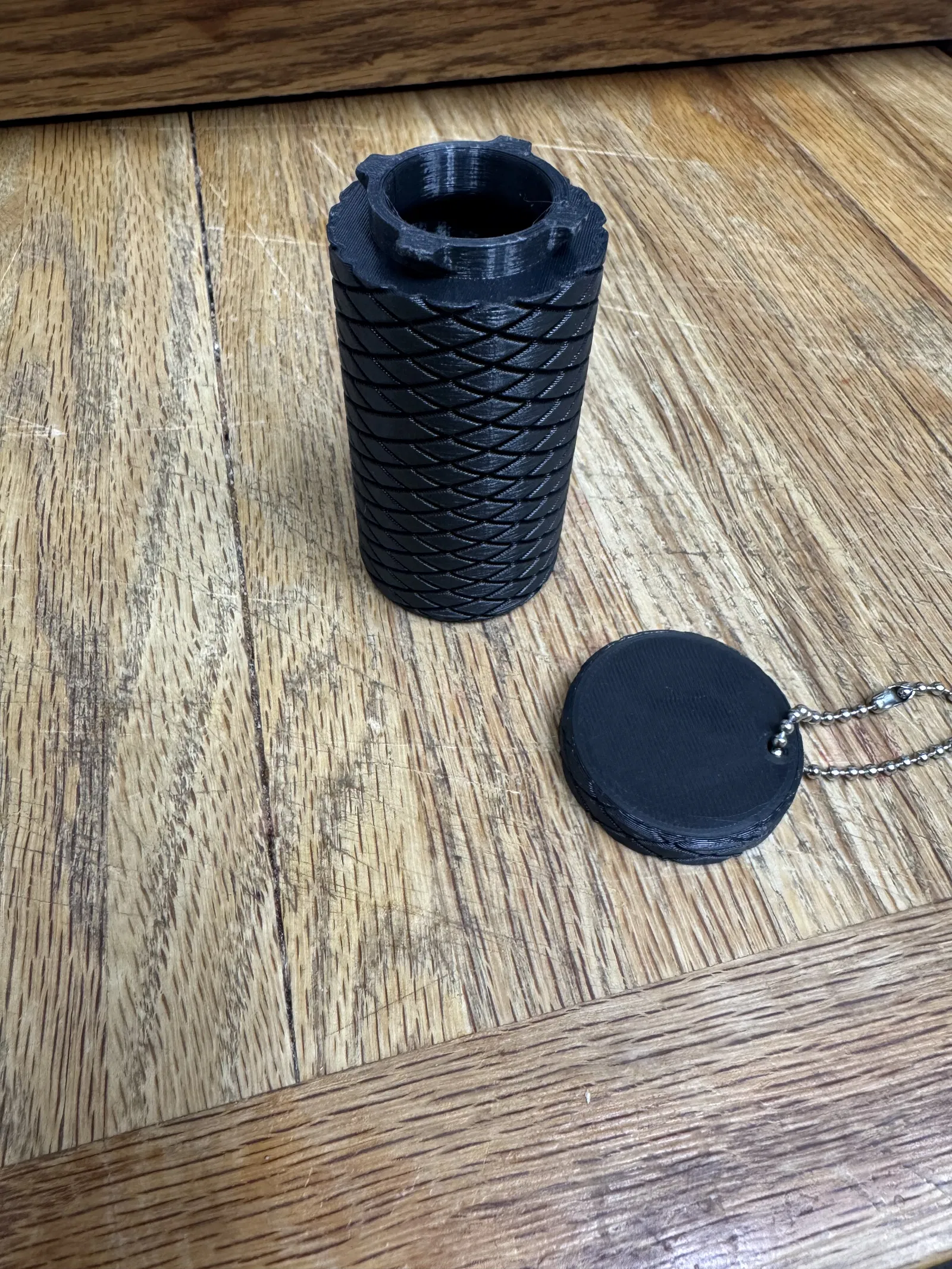 Hộp đựng đơn giản với nắp snap, thiết kế hy vọng chống nước. Kích thước phù hợp để đựng que diêm và nhiều vật dụng nhỏ khác. Có tùy chọn ren vặn phải hoặc vặn trái để tiện sử dụng.