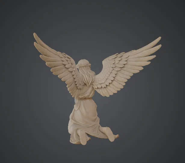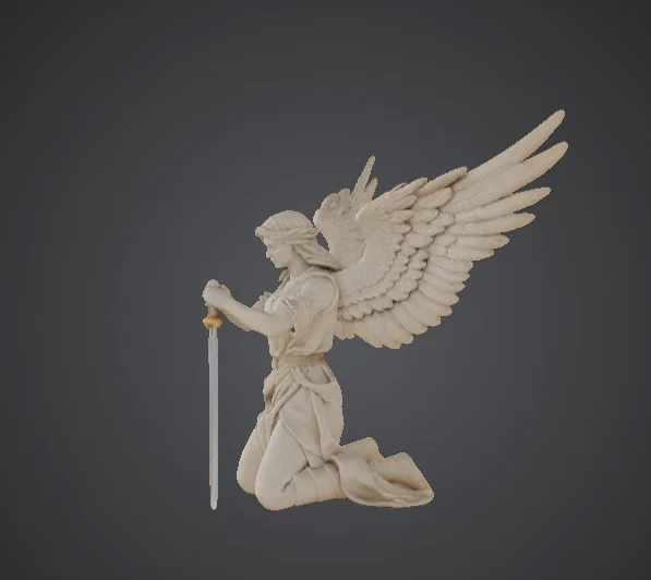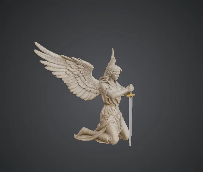 Tượng thiên thần quỳ gối với đôi cánh dang rộng, tay đặt lên chuôi kiếm hướng xuống, toát lên vẻ trang nghiêm và sức mạnh lặng thầm. Chi tiết lông cánh, áo choàng và giáp sắc nét; hợp in resin, tỉ lệ 28–32mm hoặc scale lớn.