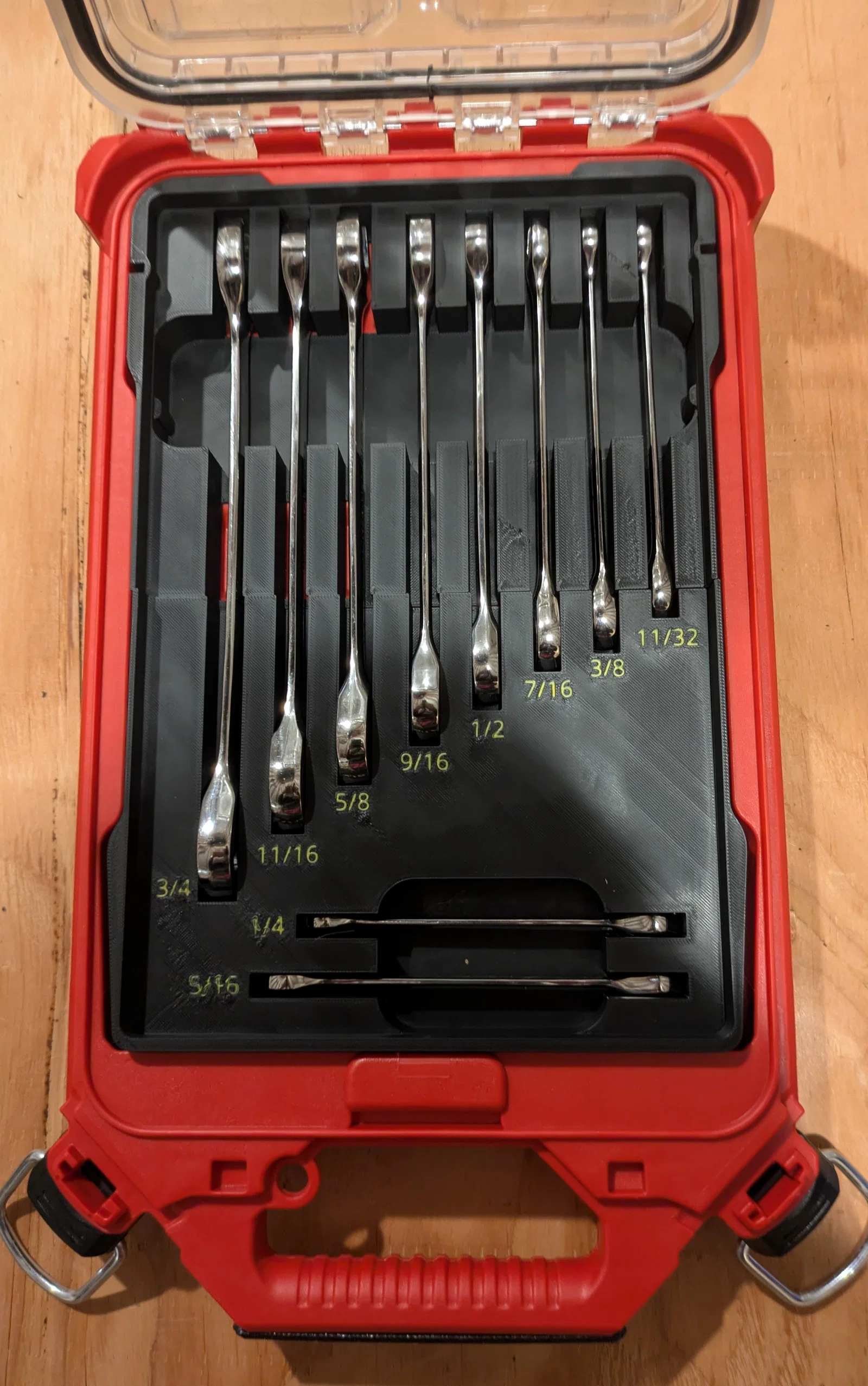 Khay insert low-profile cho Milwaukee Packout slim organizer, vừa bộ Gearwrench 10 món ratcheting wrench hệ inch (1/4"–3/4"). Có chừa khe cho đầu to của cờ lê; khuyến nghị dùng vật liệu chịu nhiệt hơn PLA nếu hay gặp nắng.