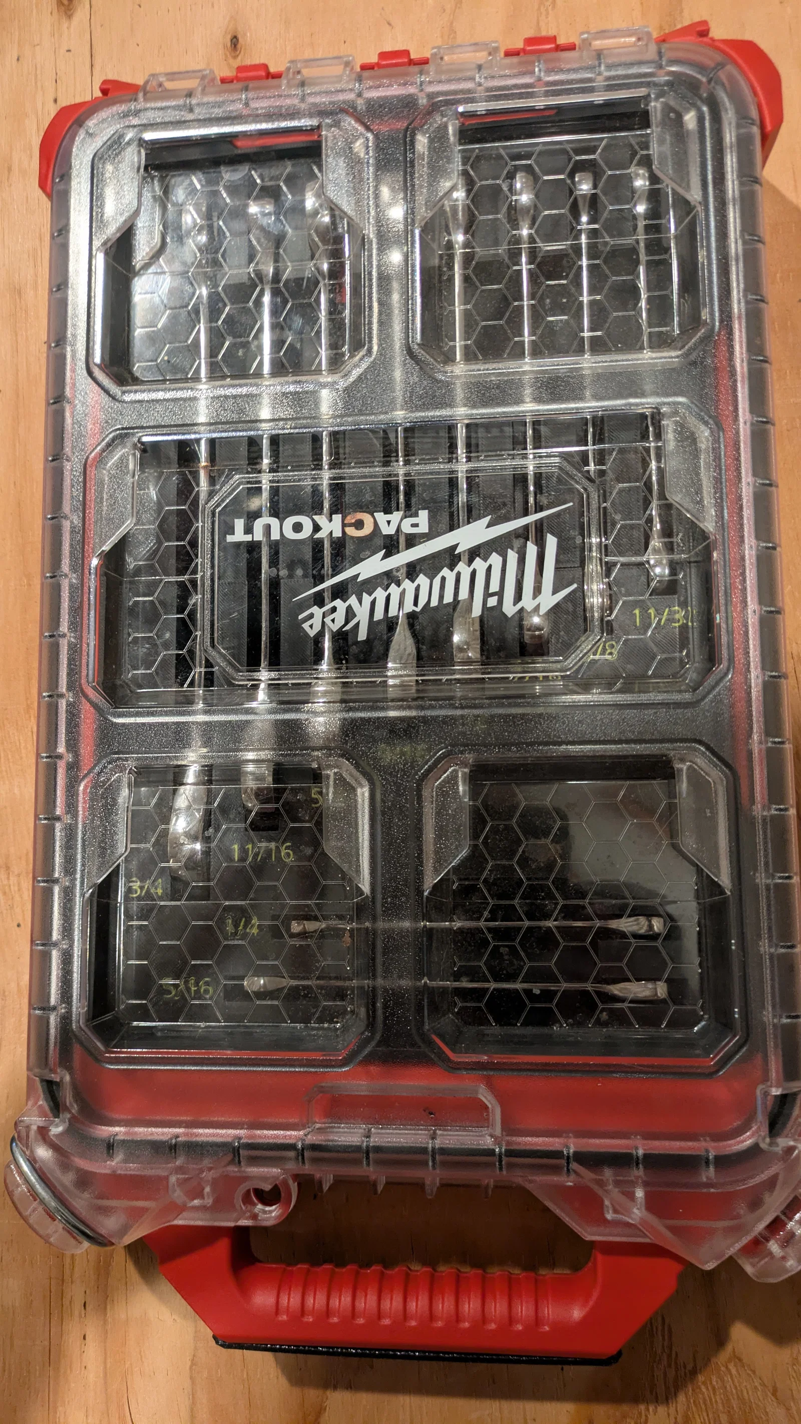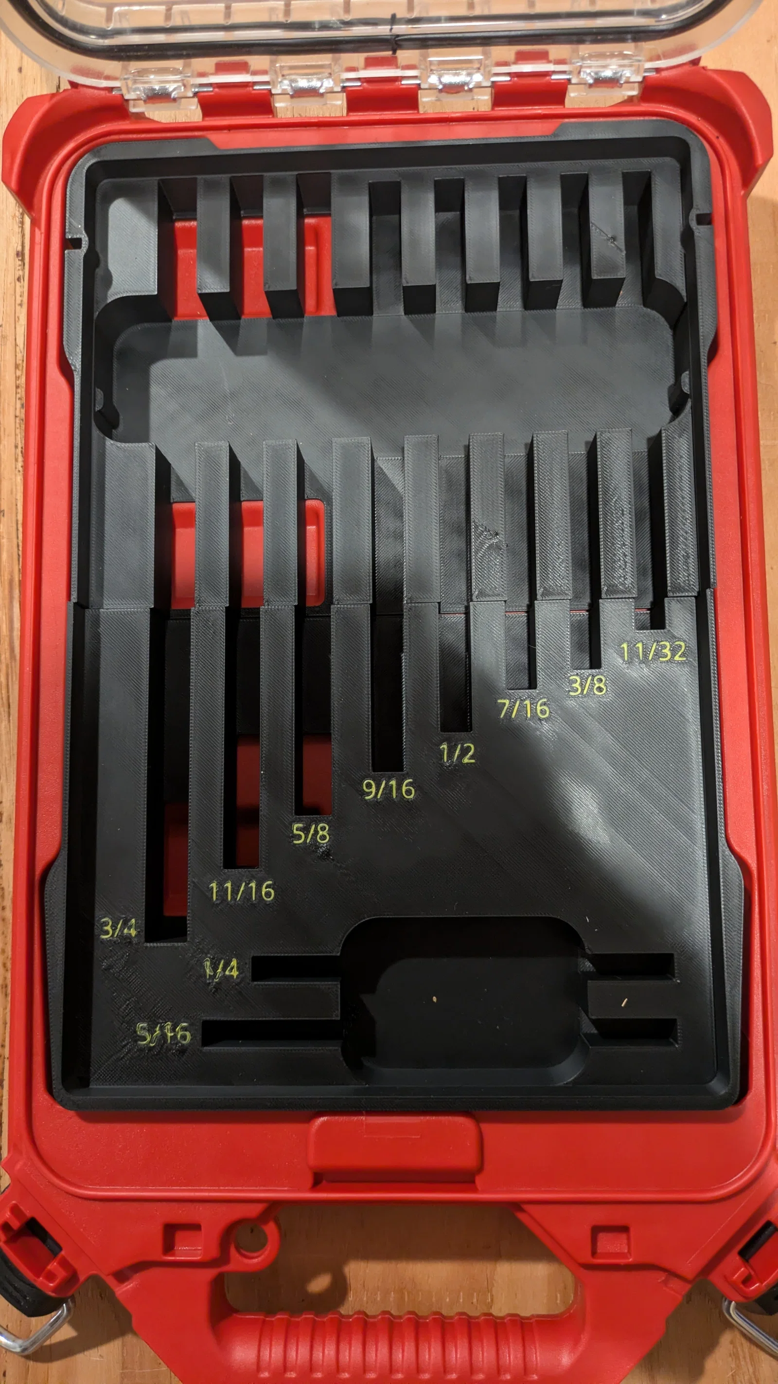 Ba khe hở ở đáy cho 3 cây lớn nhất là để chừa khoảng hở cho phần đầu to của mấy cây đó. Lắp khá khít, nhất là cây 5/8", vì nó hơi ngắn nên không với tới đúng cái “túi” ở giữa của organizer. Nếu bạn thử với cờ lê hãng khác, nhớ kiểm tra kỹ để phần đầu to không bị cấn nắp organizer. Nắp có thể hơi cong để chịu được cây nào cao hơn 1–2 mm, nhưng về lâu dài thì không nên để vậy.