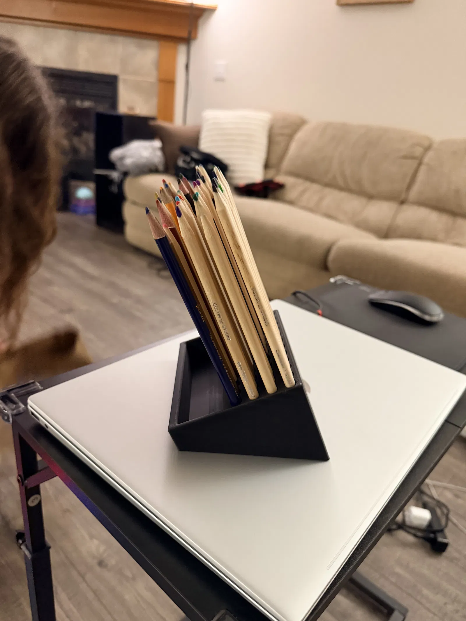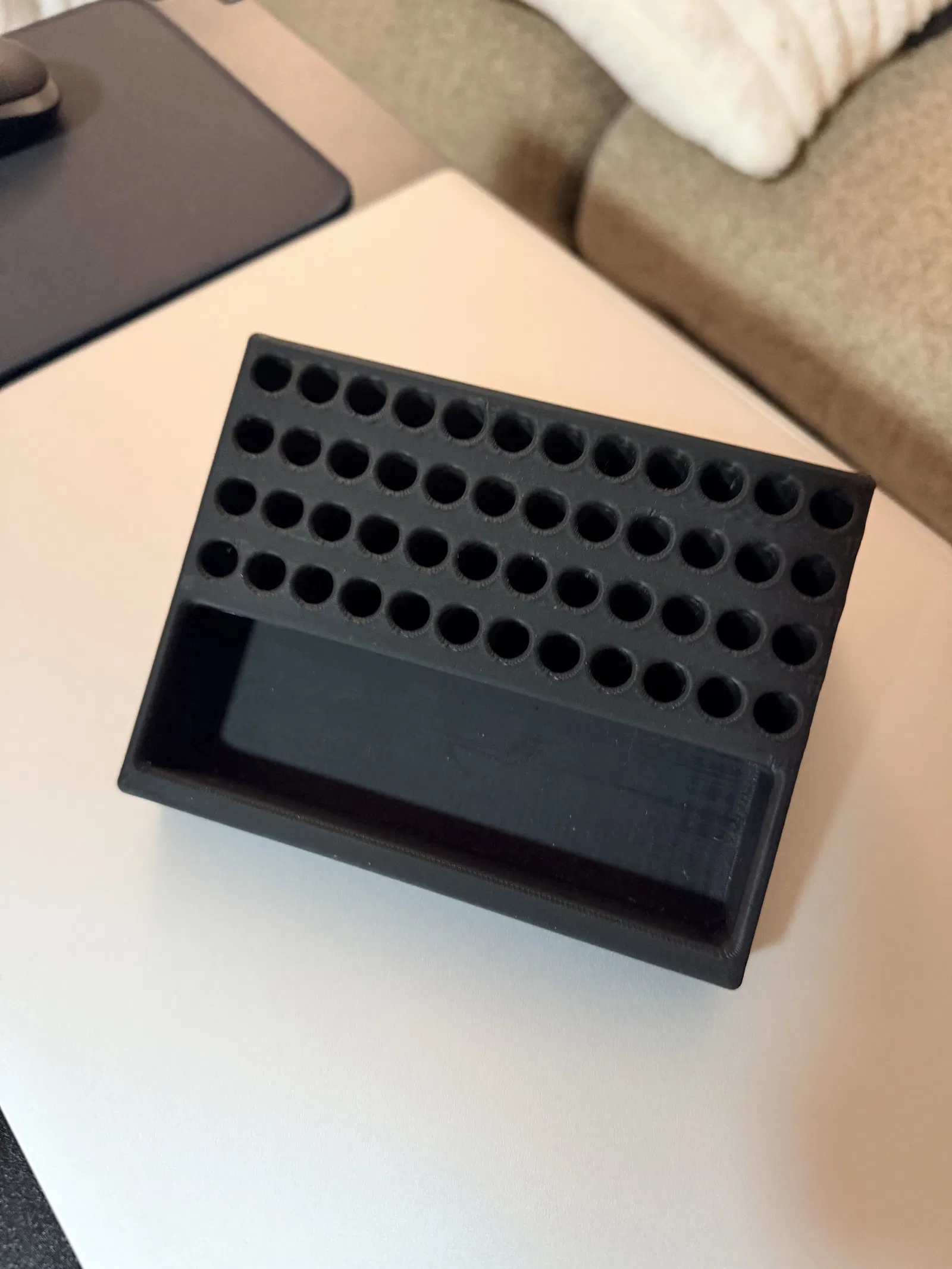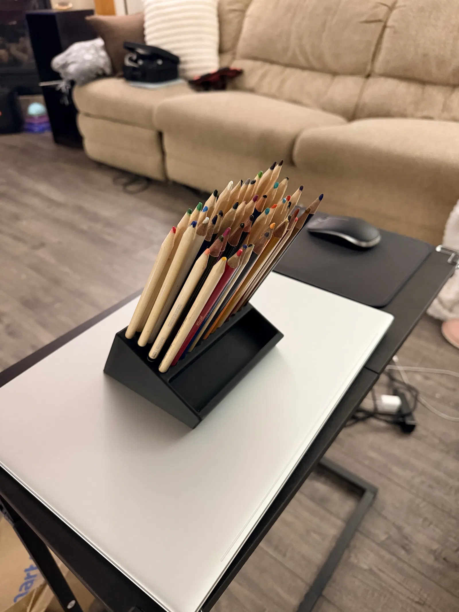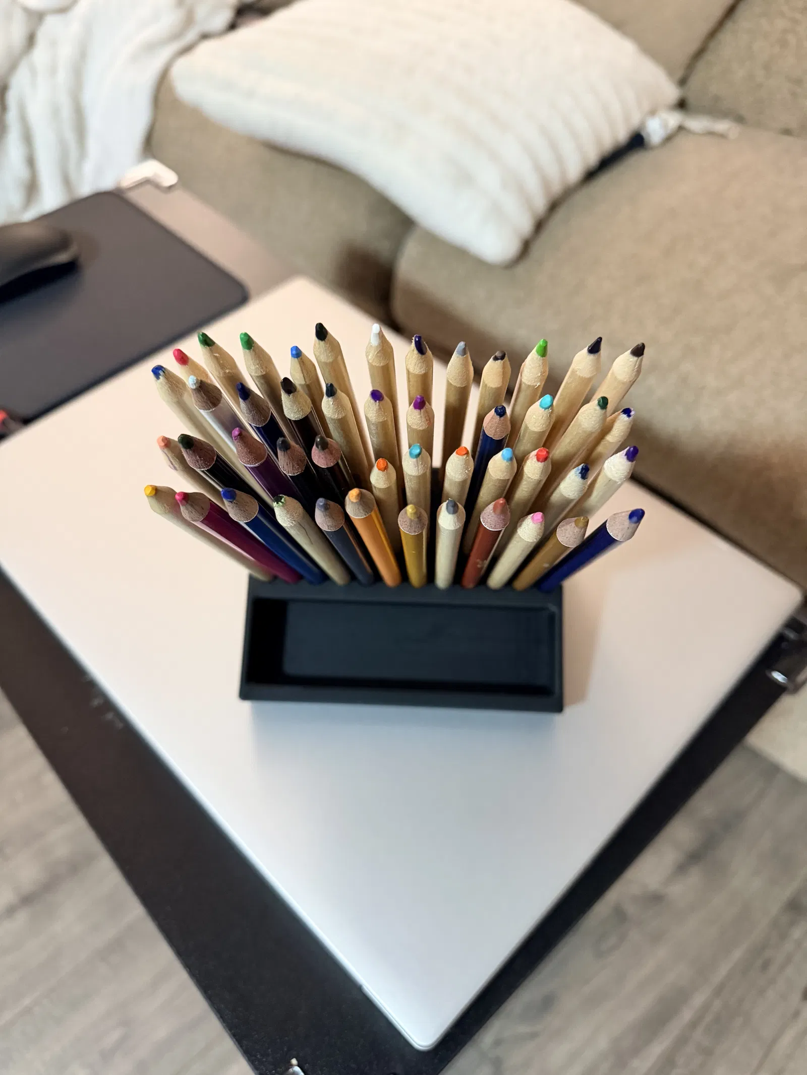 Organizer đựng bút chì màu giúp nhìn thấy toàn bộ màu và lấy bút nhanh, không cần lục hộp bút. Thiết kế chứa 48 cây, in PLA, 15% infill Grid cho chắc phần lỗ cắm, không cần supports. Có 2 phiên bản.