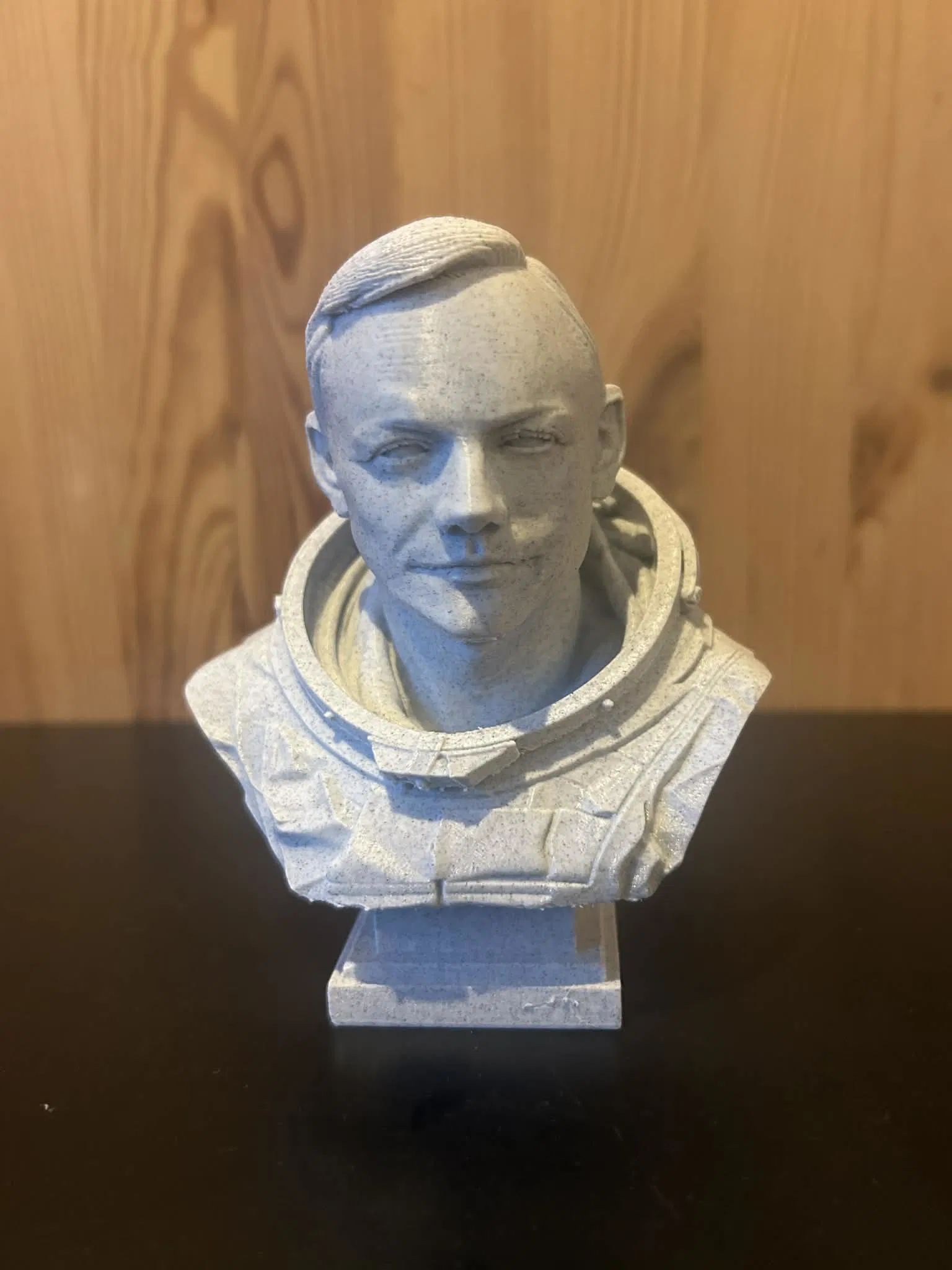 Tượng bán thân này khắc họa Neil Alden Armstrong, lấy cảm hứng từ bức ảnh biểu tượng nhất của phi hành gia: chân dung chính thức của ông trong sứ mệnh Apollo 11. Khuôn mặt được thể hiện theo phong cách điêu khắc cổ điển, làm nổi bật những đường nét điềm tĩnh, ánh nhìn kiên định và biểu cảm trầm ổn đã in sâu trong ký ức tập thể thời kỳ chinh phục không gian.