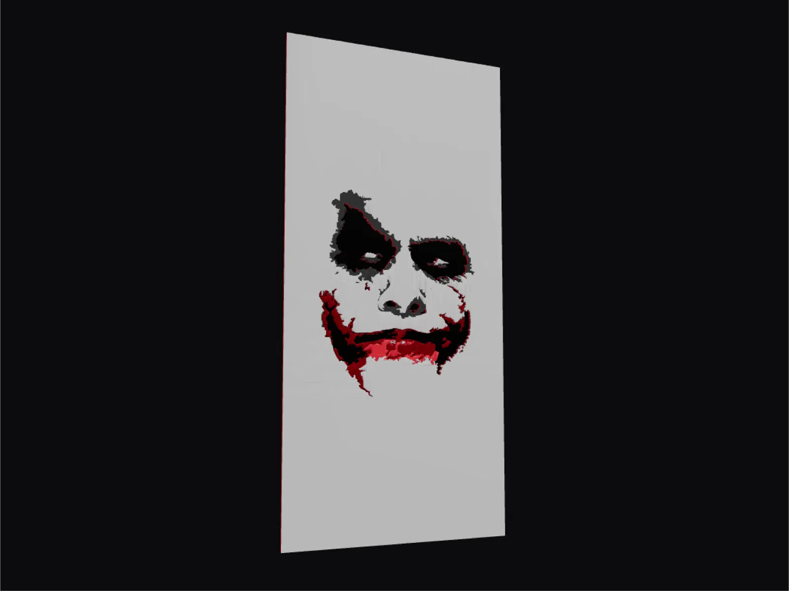 Mẫu jocker hueforge dạng Hueforge kèm thông số in 3D và kế hoạch đổi màu theo từng layer. Có layer height 0.050 mm, first layer 0.100 mm, infill 100%, bắt đầu màu #000000 và đổi màu theo mốc lớp.