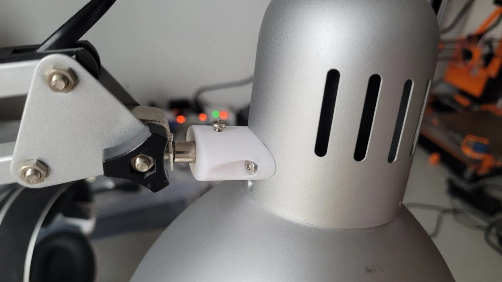 Mảnh nối giữa chao đèn và cánh tay của đèn Tertial của tôi từ Ikea đã bị gãy, vì vậy tôi đã thiết kế một bộ phận thay thế chỉ cần được kẹp vào bản lề, và có thể được cố định bằng một con vít nhưng nó vừa khít với tôi nên tôi thực sự không cần nó.
