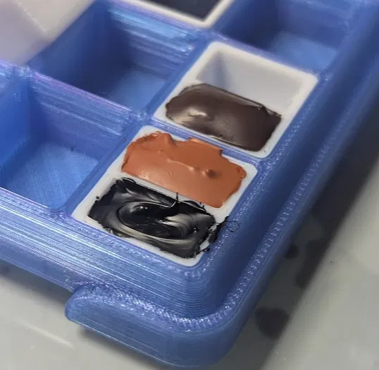Đây là một khay màu watercolor dạng half pan có thêm vách ngăn bên trong để có thể chứa được hai màu. Mình cần một khay split pan vừa với , và mẫu half pan này vừa khít luôn, nên mình remix lại cho đúng nhu cầu của mình.