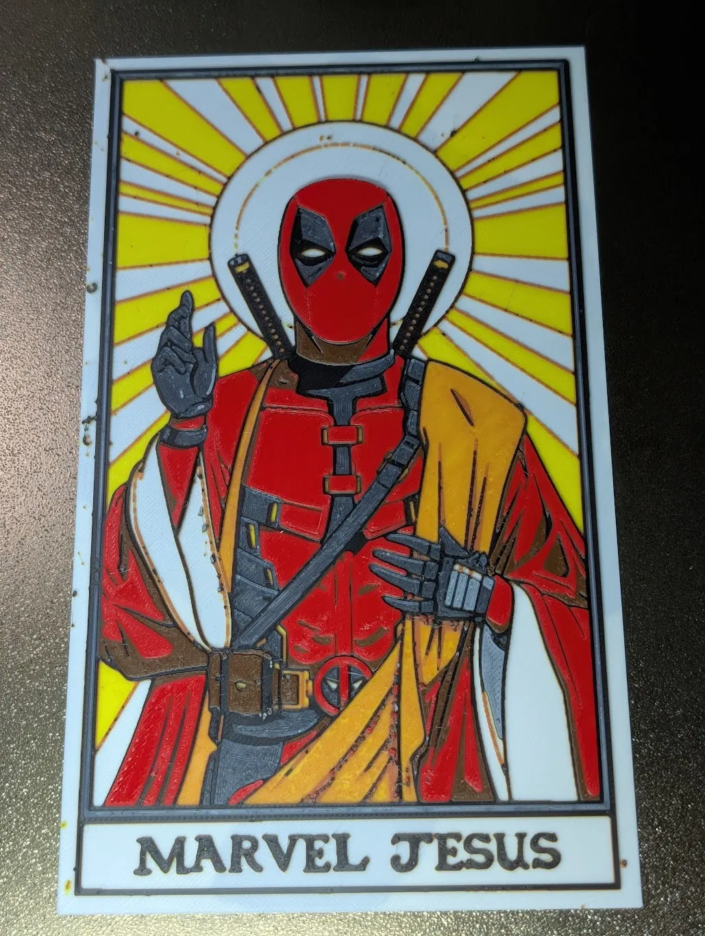 Mẫu Hueforge “Marvel Jesus” tái hiện Deadpool trong hình tượng Chúa Jesus. Kích thước 118.83x200mm, in 100% infill, layer height 0.04mm (base 0.16mm). Có 9 filament và lịch đổi màu theo từng layer.