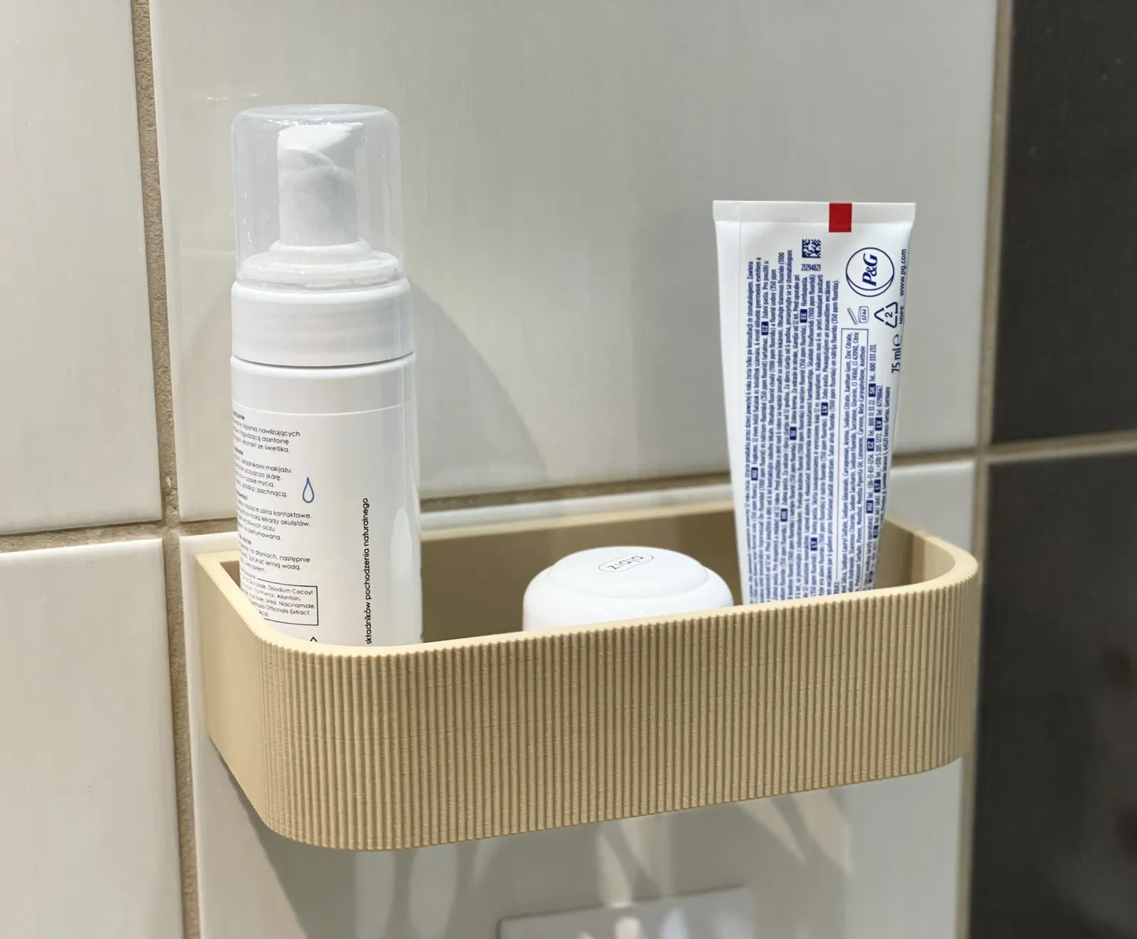Một kệ phòng tắm gắn tường tiện dụng, thiết kế để dùng hằng ngày cho gọn gàng và dễ vệ sinh.