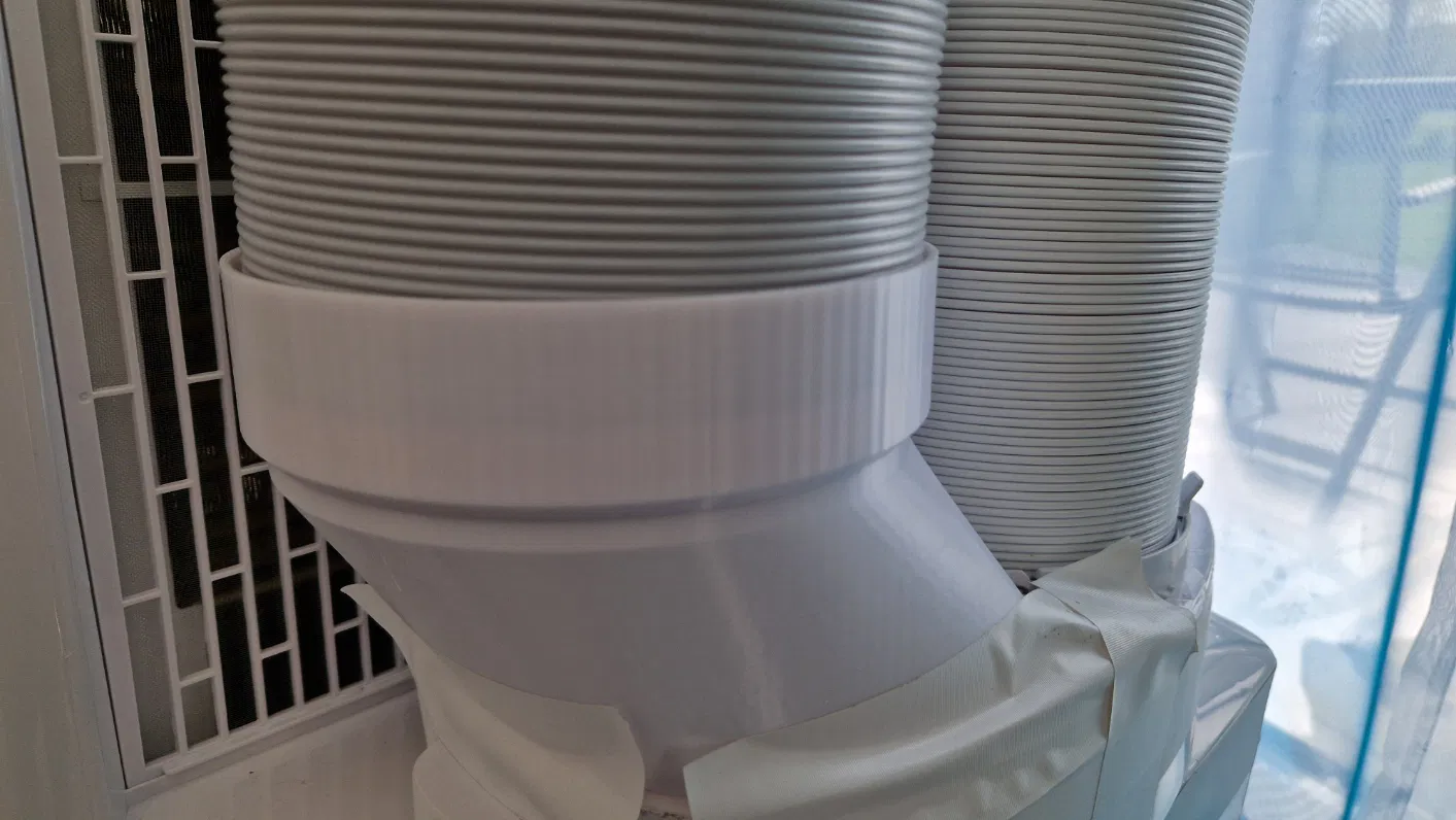 Adapter cho Midea Real Cool 35 với phần kết nối ống được nới rộng, giúp ống nguyên bản loại 150 (kèm end piece) lắp vừa và kín hơn. Đây là bản remix dựa trên mẫu Thingiverse.