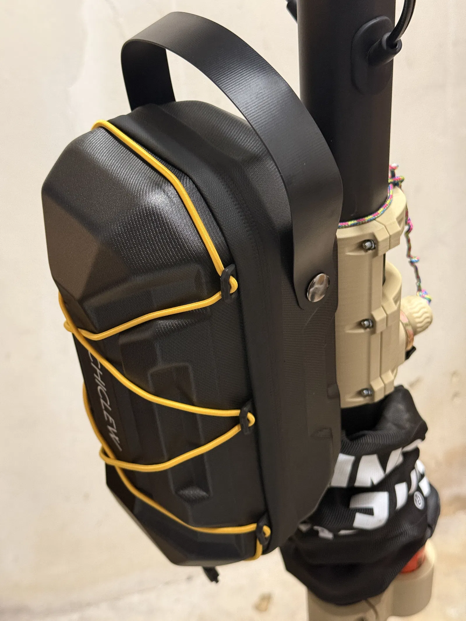 Một cái bracket giúp cố định đúng chuẩn túi Chiclew Scooter bag lên VMAX New VX2 (Hub/Gear).