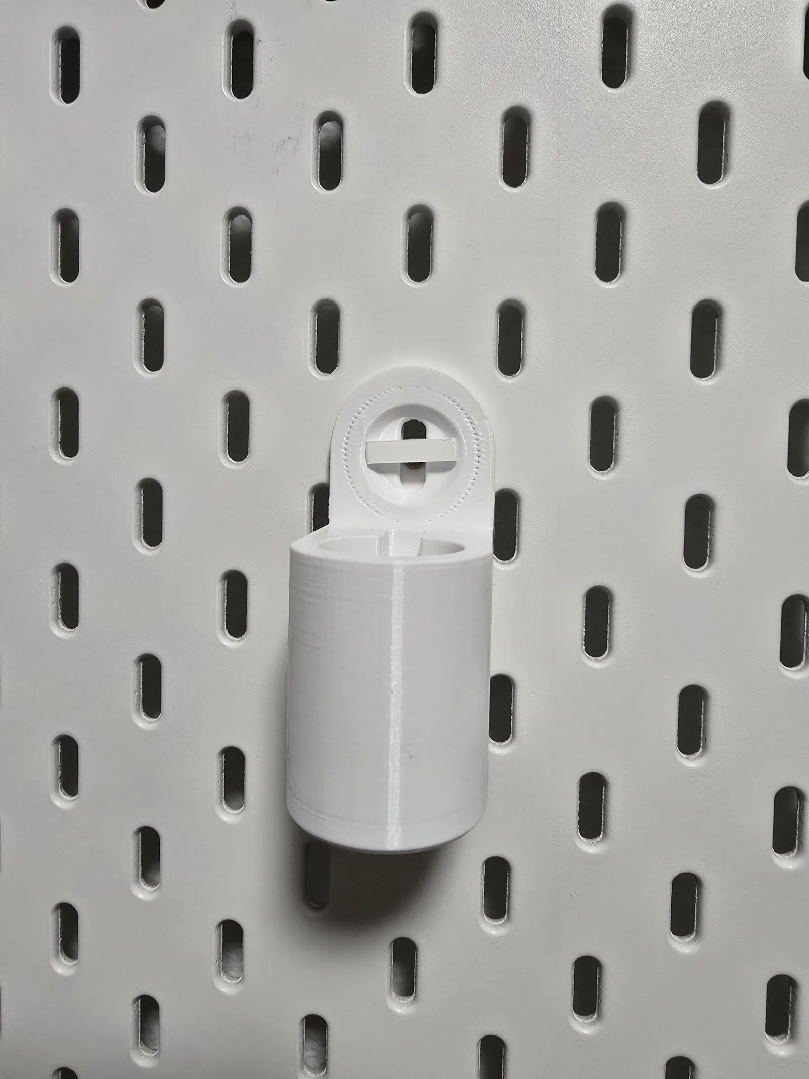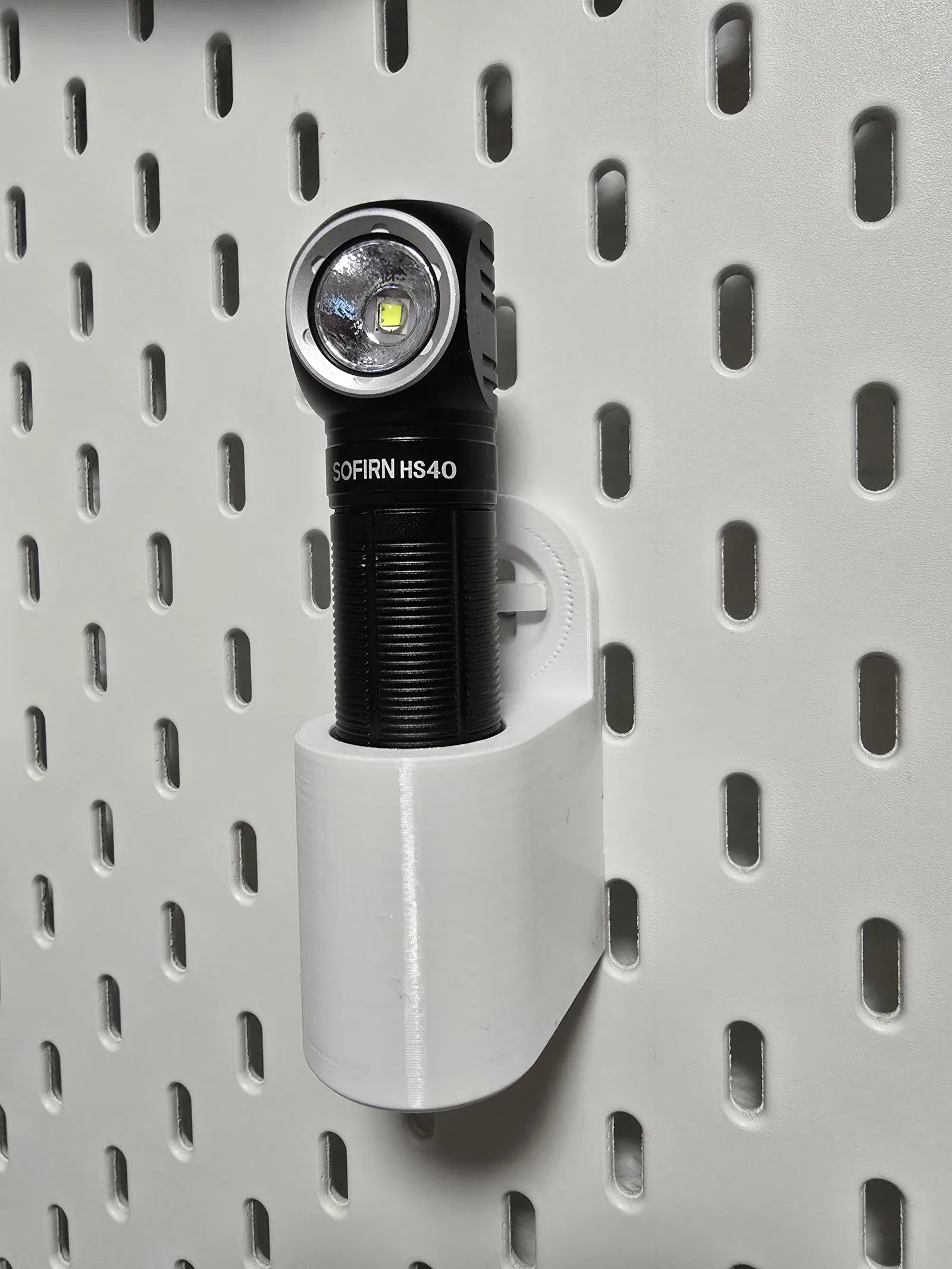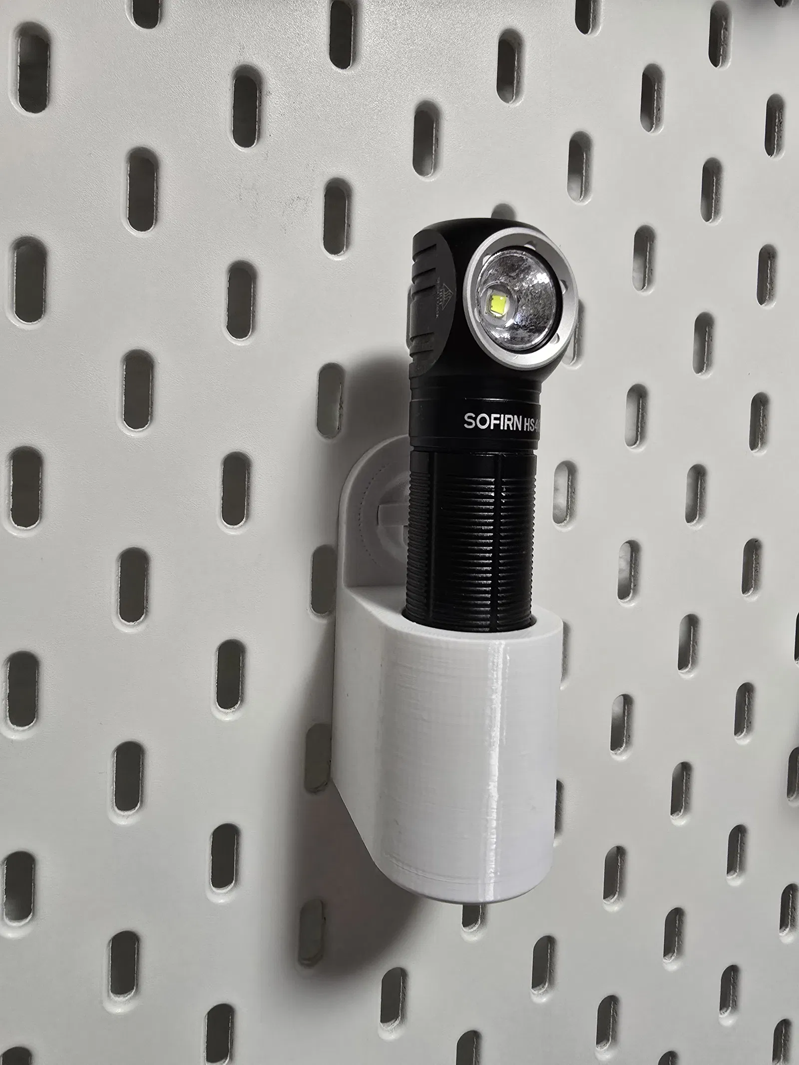 Giá đỡ đèn pin Sofirn SH40 cho bảng IKEA Skadis, dùng hệ T-clip. Thiết kế để có thể cất theo chiều dọc mà không cần tháo phần ngàm/clip gắn.