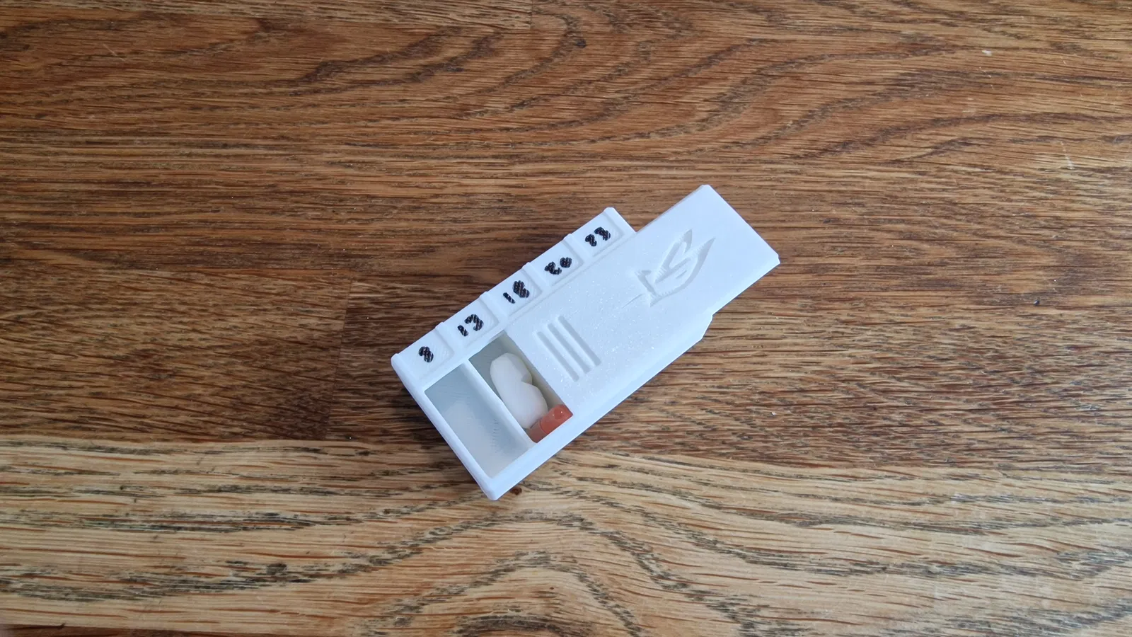 Để tiện sắp xếp, mặt trên của nắp có các hõm nhỏ dạng lõm. Bạn có thể dùng bút fine-liner hoặc bút lông dầu (permanent marker) để ghi thứ trong tuần hoặc khung giờ cụ thể, tùy biến lịch dùng thuốc theo nhu cầu.