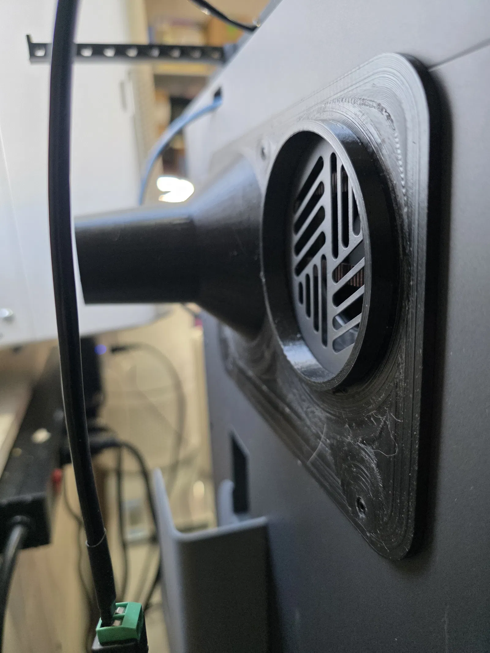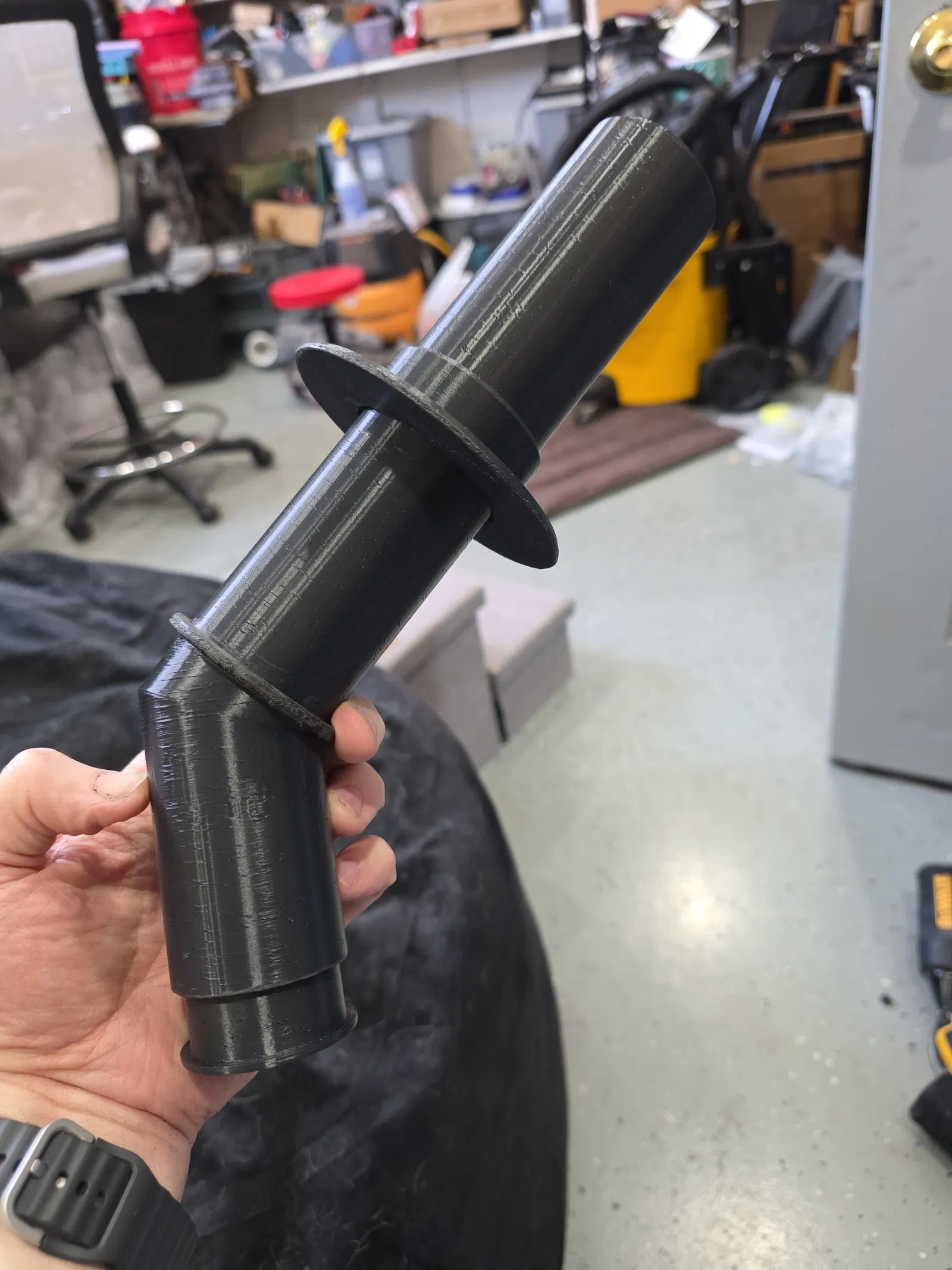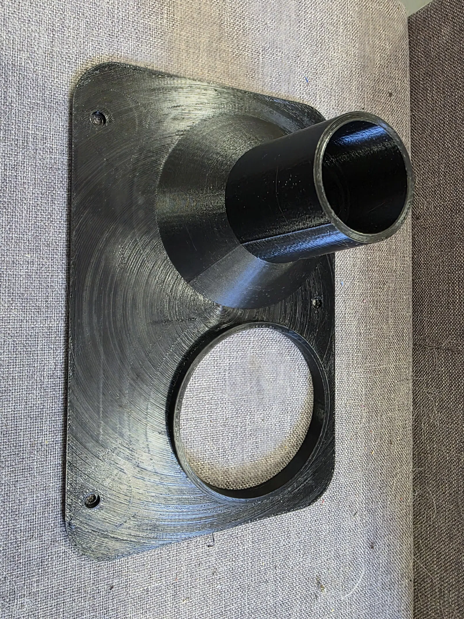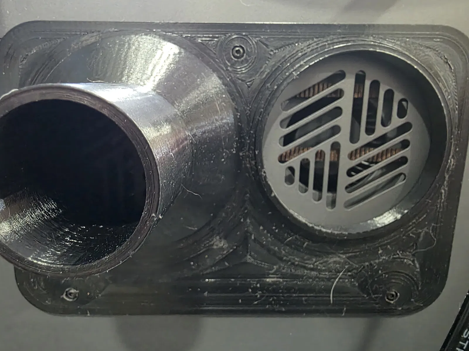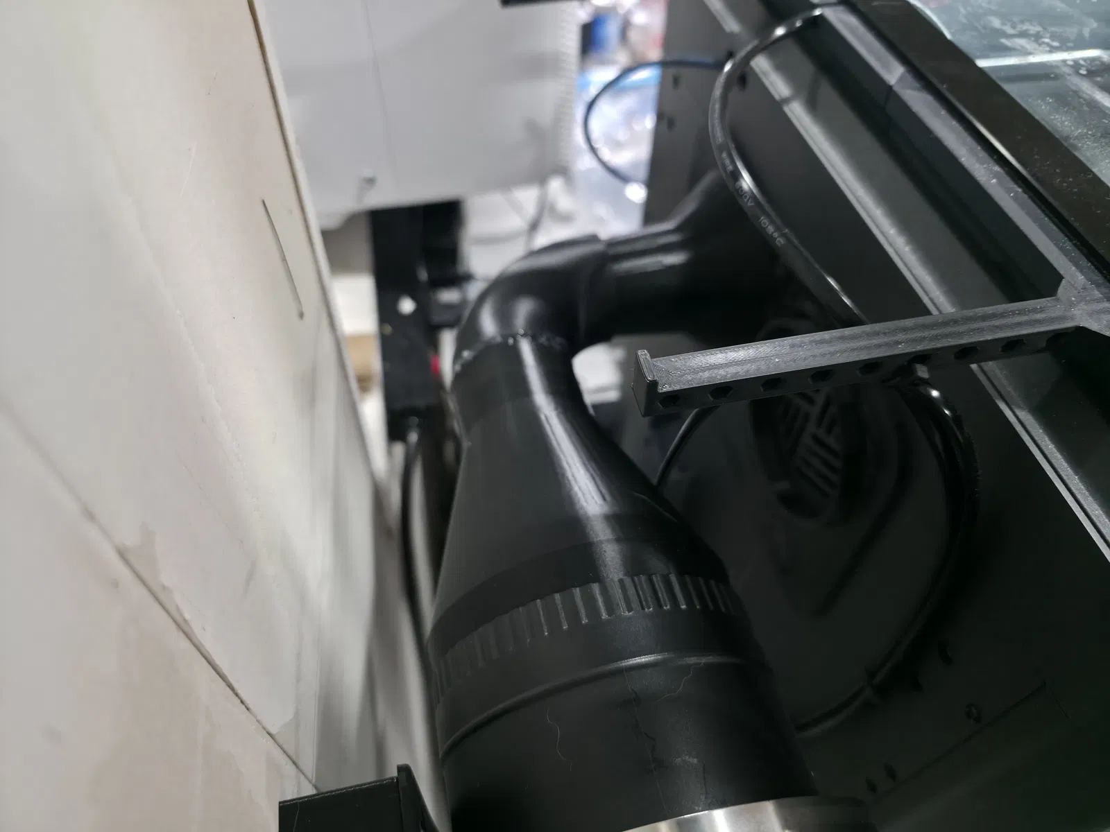 Mình in phần ống xuyên tường (wall penetration) bằng ASA, còn lại của hệ thống thì in bằng PETG đen mờ (matte black). Mỗi chi tiết đều có dạng socket cho đầu đực hoặc đầu cái, và mình hàn/dán các phần lại với nhau bằng Weld-On #3. Chỉ cần quét một ít lên mỗi phần, ép giữ khoảng 30 giây là nó dính. Mình thường để tầm 1 tiếng rồi mới cầm nắm các chi tiết đã dán, và 24 tiếng để keo cure hoàn toàn. Ống xuyên tường được in thành 2 phần và phải dán lại với nhau trước khi lắp vào tường. Quạt hút ống gió (inline duct fan) là loại 4" chỉnh tốc độ (variable speed) mình mua trên Amazon. Chạy êm và hiệu quả. Quạt và đoạn nối co (elbow) vào manifold là lắp ép (friction fit) và KHÔNG dán keo. Gasket là TPU và là tuỳ chọn. Mình thấy dùng hay không cũng không khác biệt nhiều, nhưng mình thích có tuỳ chọn đó.