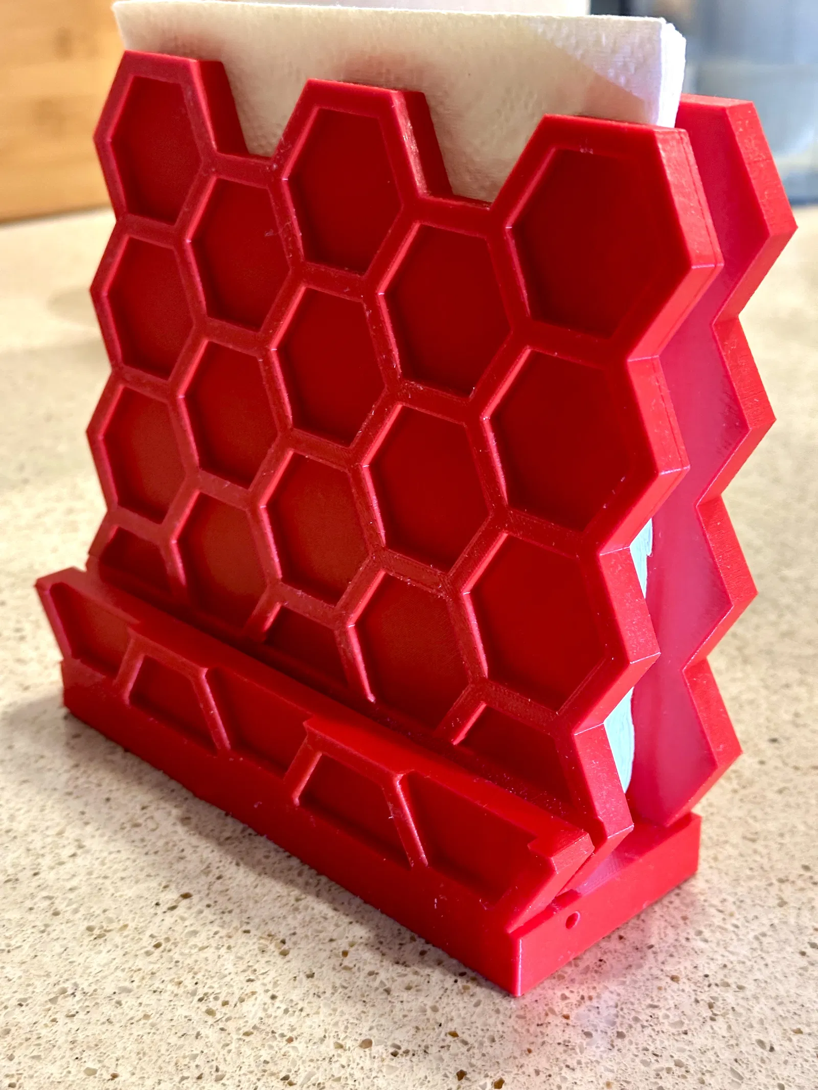 Giá giữ khăn ăn Magnetic Napkin Holder dùng 2 nam châm neodymium đẩy nhau như “lò xo” để ép hai bên lại, giữ khăn chắc chắn. In 0.2mm, ~15% infill, không cần supports; nhớ pause để lắp nam châm.