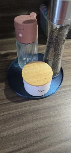 Xếp đồ lên: Đặt muối, tiêu, chai xịt dầu lên trên. Viền gờ nhô lên giúp đồ không bị văng ra nếu xoay nhanh.