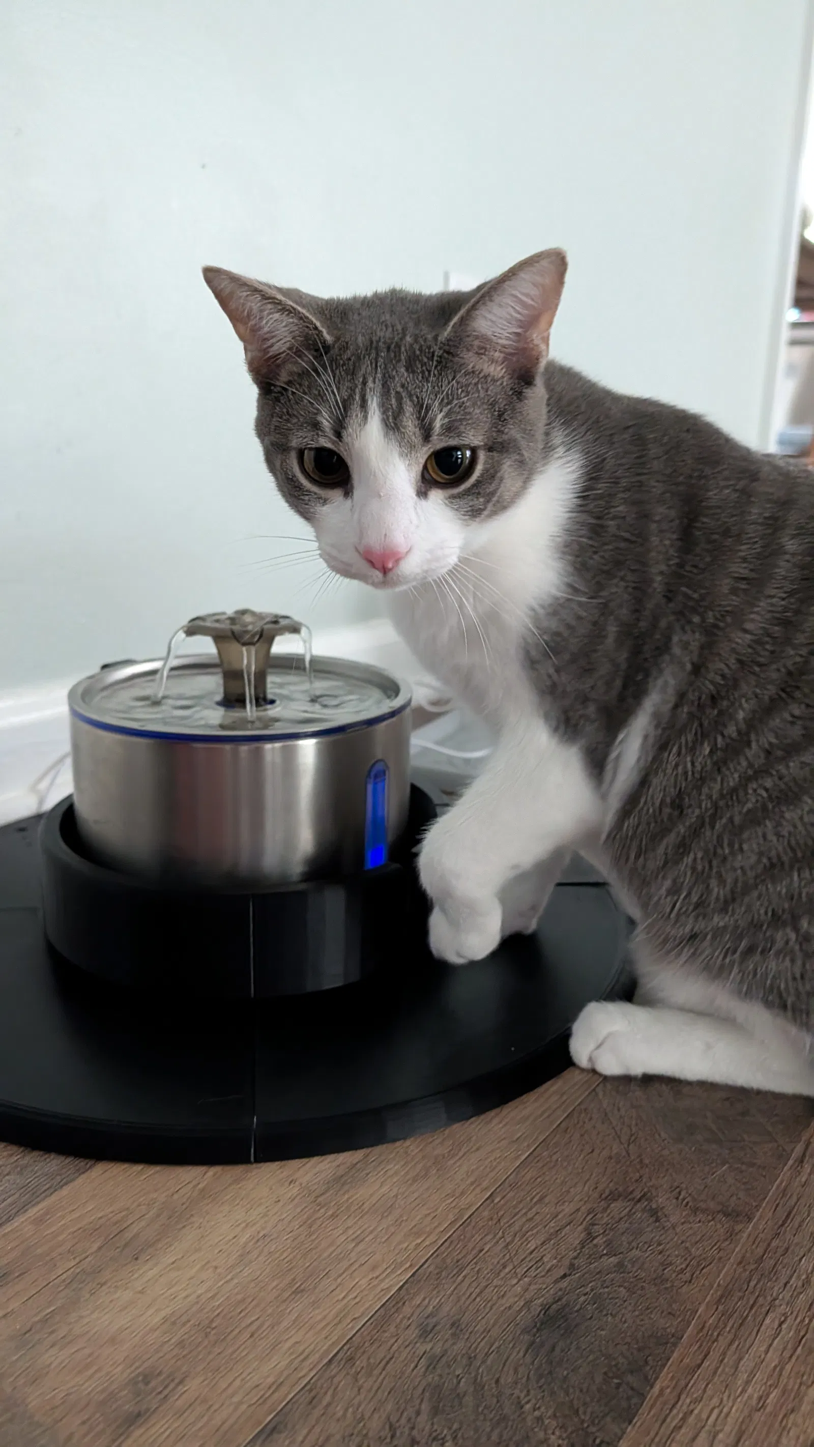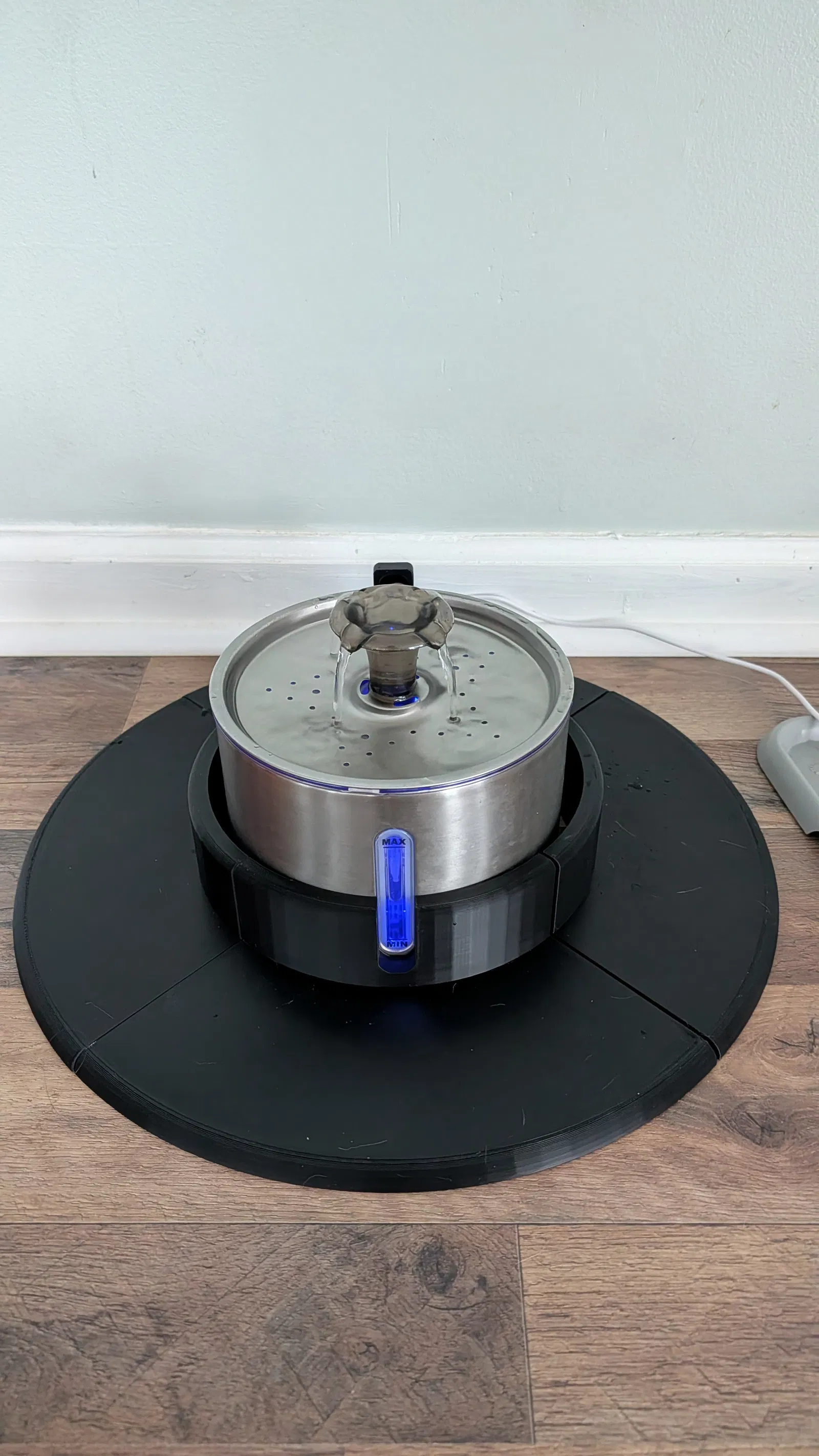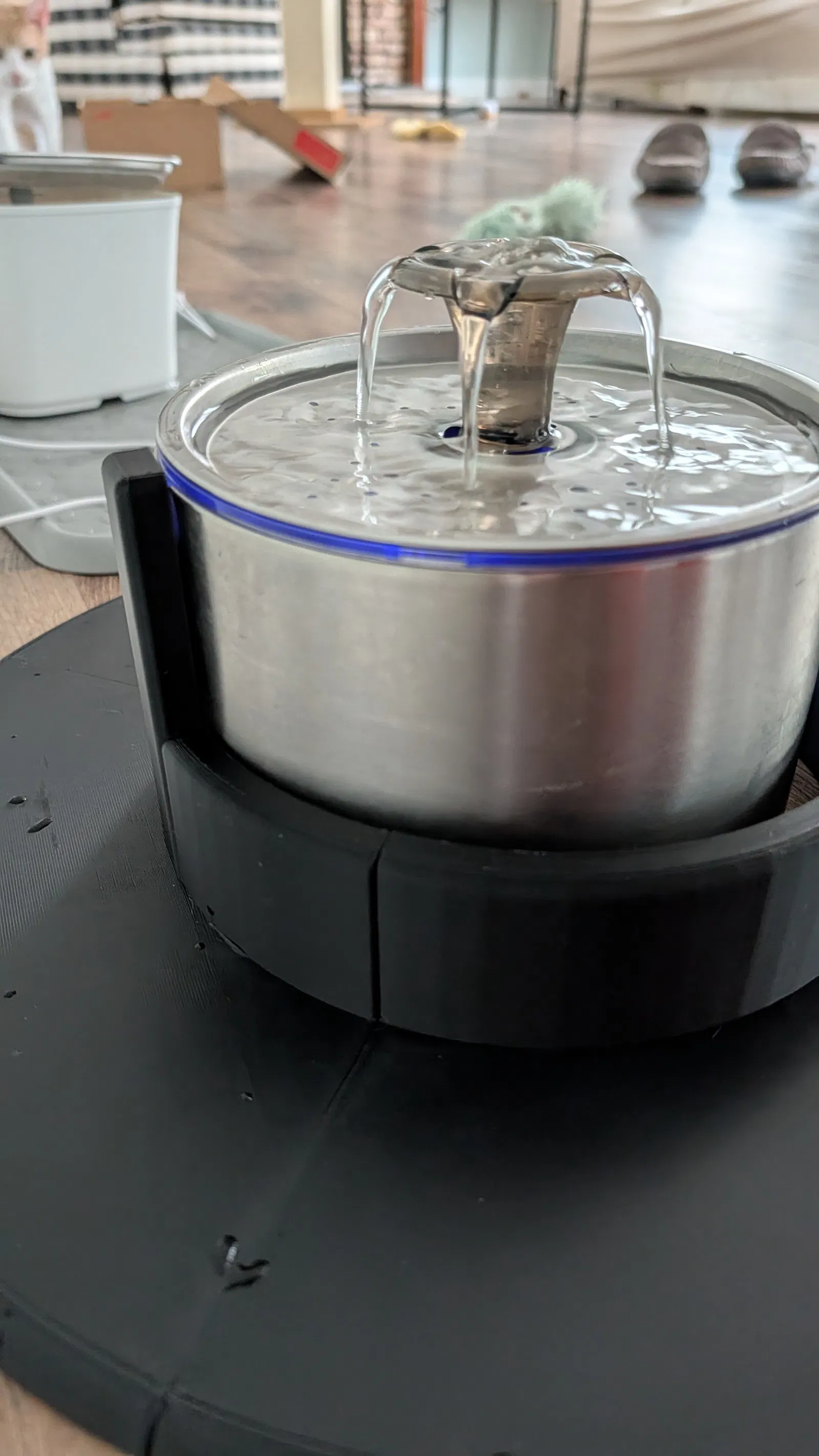 Mình làm cái “skirt” này để che (hide) dây bơm, để mèo không dễ gặm, đồng thời làm thành một cái brim bản rộng. Phần đế được “giữ chặt” nhờ chính con mèo: khi nó đứng lên brim để cố hất ngã cái fountain thì nó lại vô tình đè lên đế, khiến mục tiêu của nó tự bị vô hiệu mà nó không nhận ra.