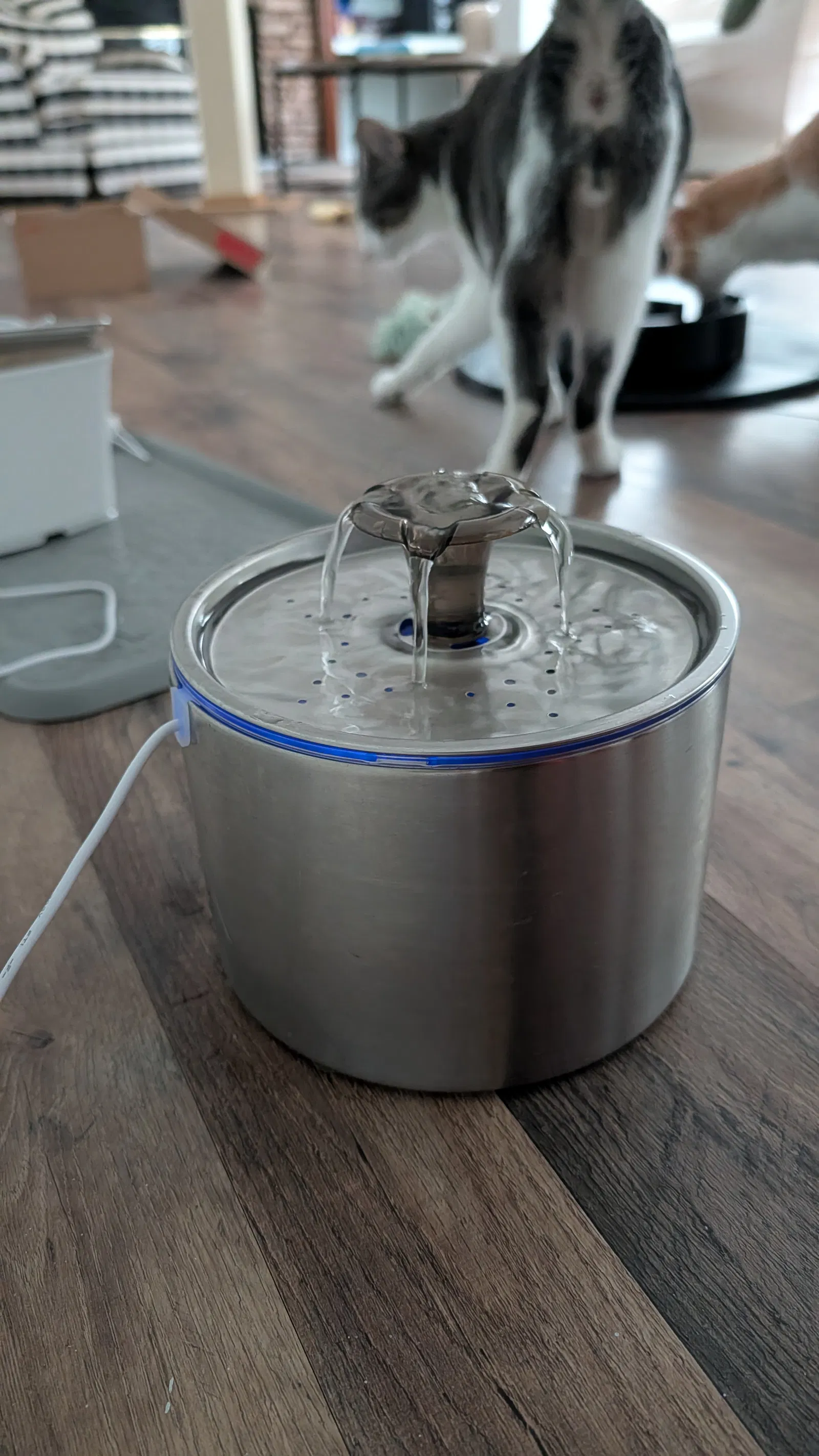 Mèo nhà mình rất khoái “tấn công” cái máy nước uống (water fountain) mình mua cho nó. Kết quả là nó hay hất nắp ra, giật cái dây điện chạy tới bơm và làm đổ nước ra sàn.