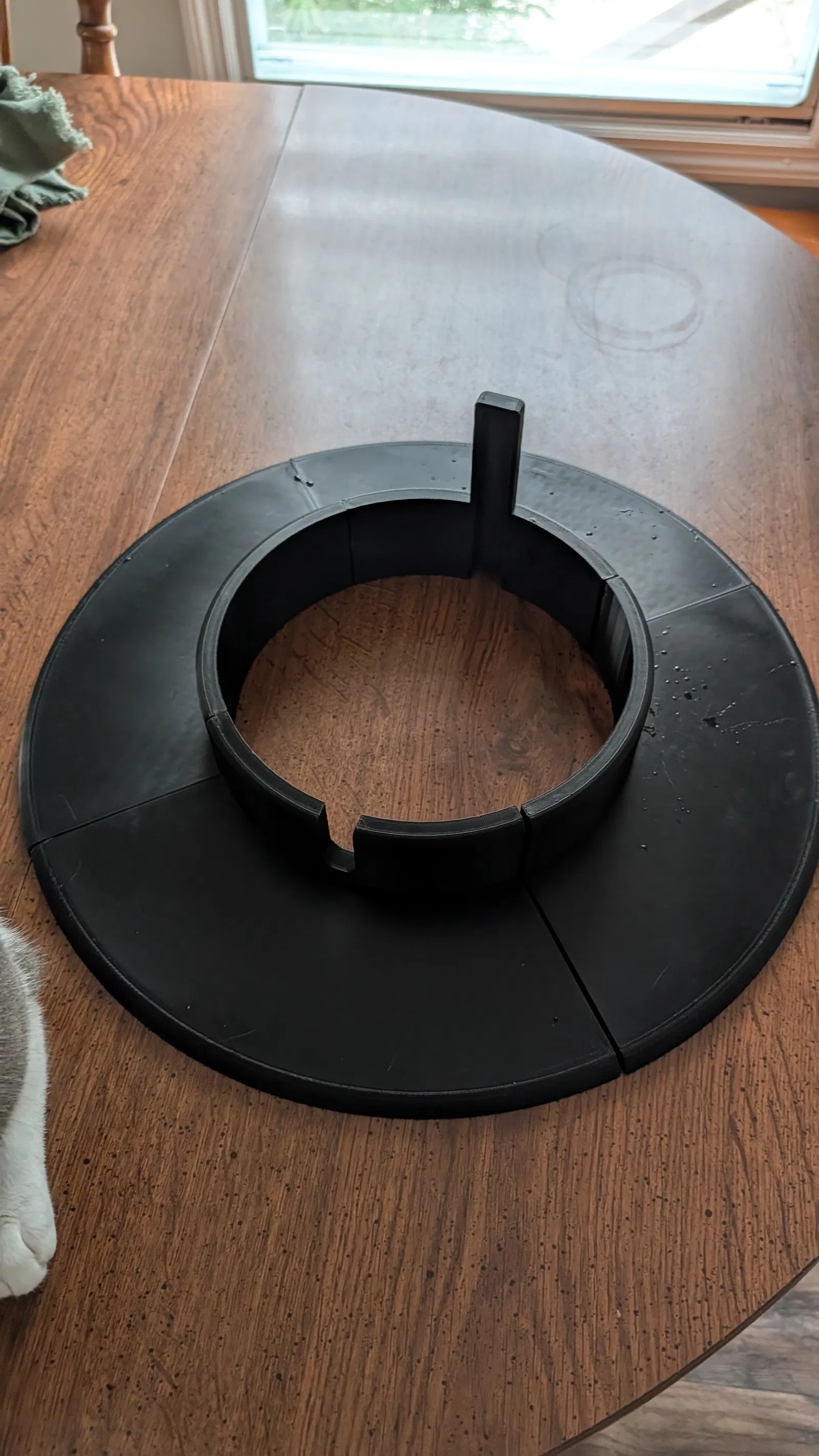 Skirt/brim bản rộng cho cat water fountain (đường kính đặt trong 200mm), giúp mèo khó hất ngã và che dây bơm để không dễ bị gặm. Thiết kế 4 mảnh multi-part, in khoảng 9 giờ và dán bằng Super glue.