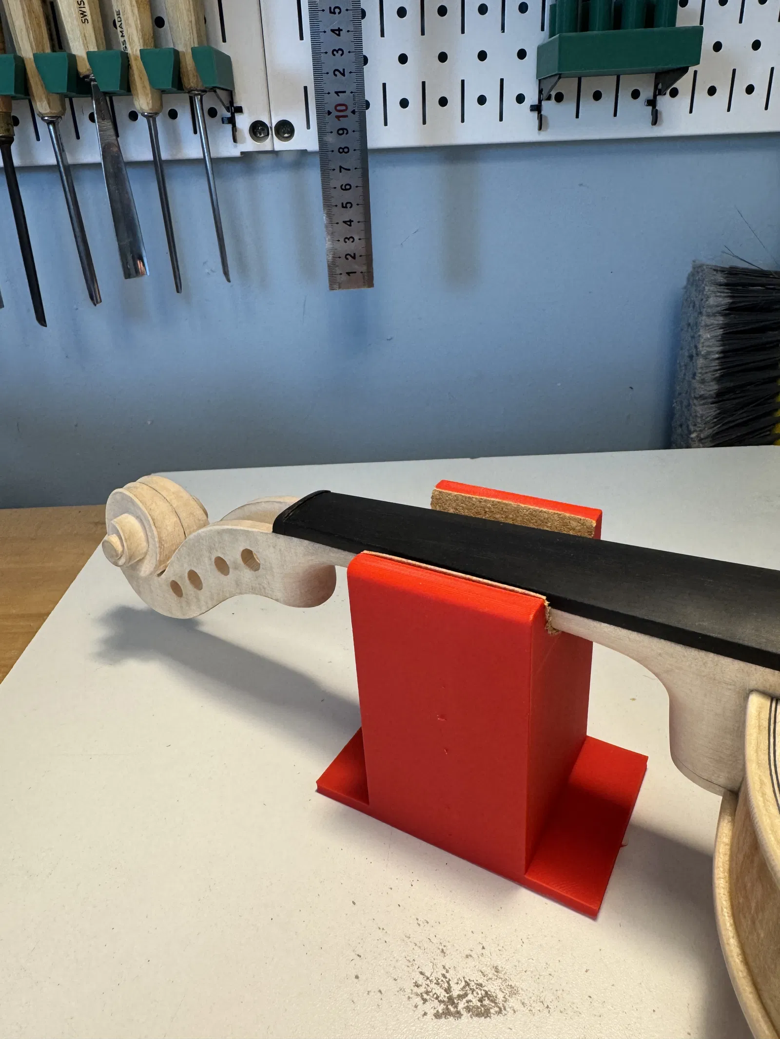 Bộ giá đỡ giúp nâng violin đang làm dở lên khỏi mặt bàn: một phần gắn vào lỗ endpin (cần tháo endpin), phần còn lại đỡ neck. Rất tiện khi sơn varnish; nên in chắc và dán cork để tránh trầy.