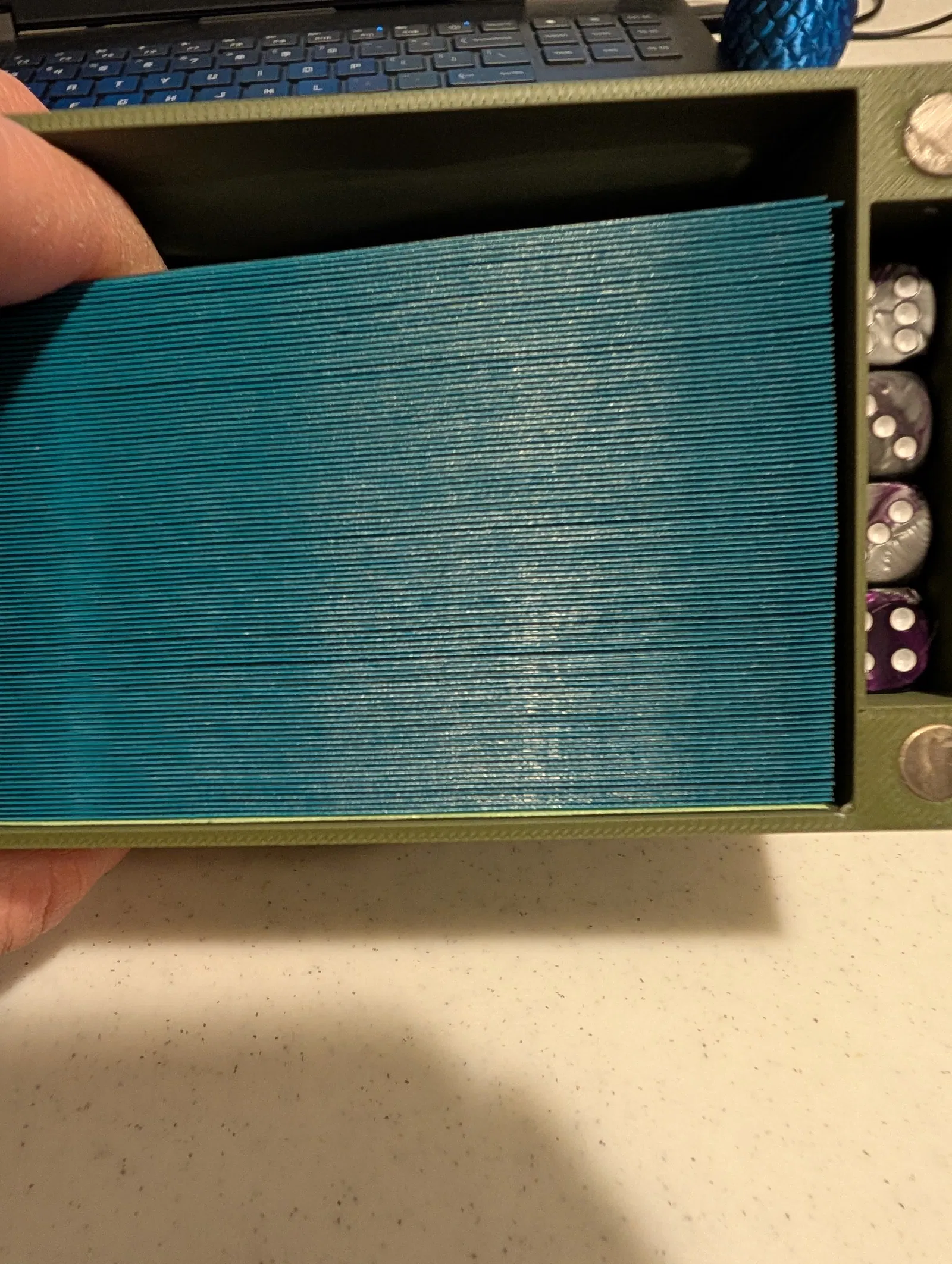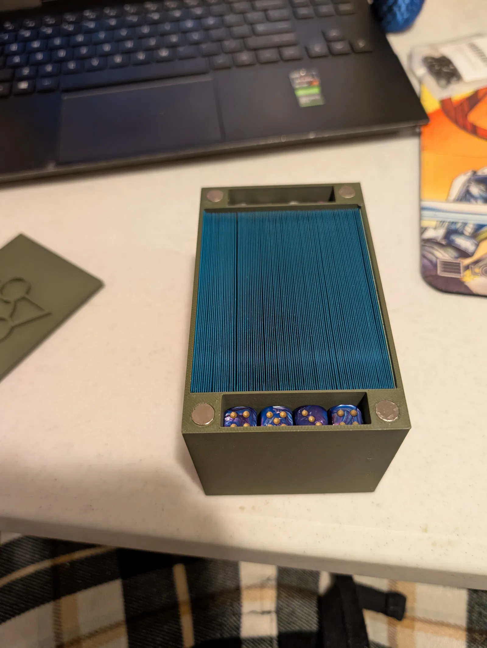 Mình nghĩ ra ý tưởng để bộ bài nằm nghiêng một bên. Mình muốn dùng nam châm, nhưng các thiết kế trước đây của mình đều không hoạt động đúng như mình hình dung. Thiết kế này có các phần khoét ở trên và dưới của khu vực để deck, vừa khít để nhét các viên D6 nhỏ hoặc những món token khác (như các miếng bìa cắt sẵn trong bộ pre-release và Pre-Con).