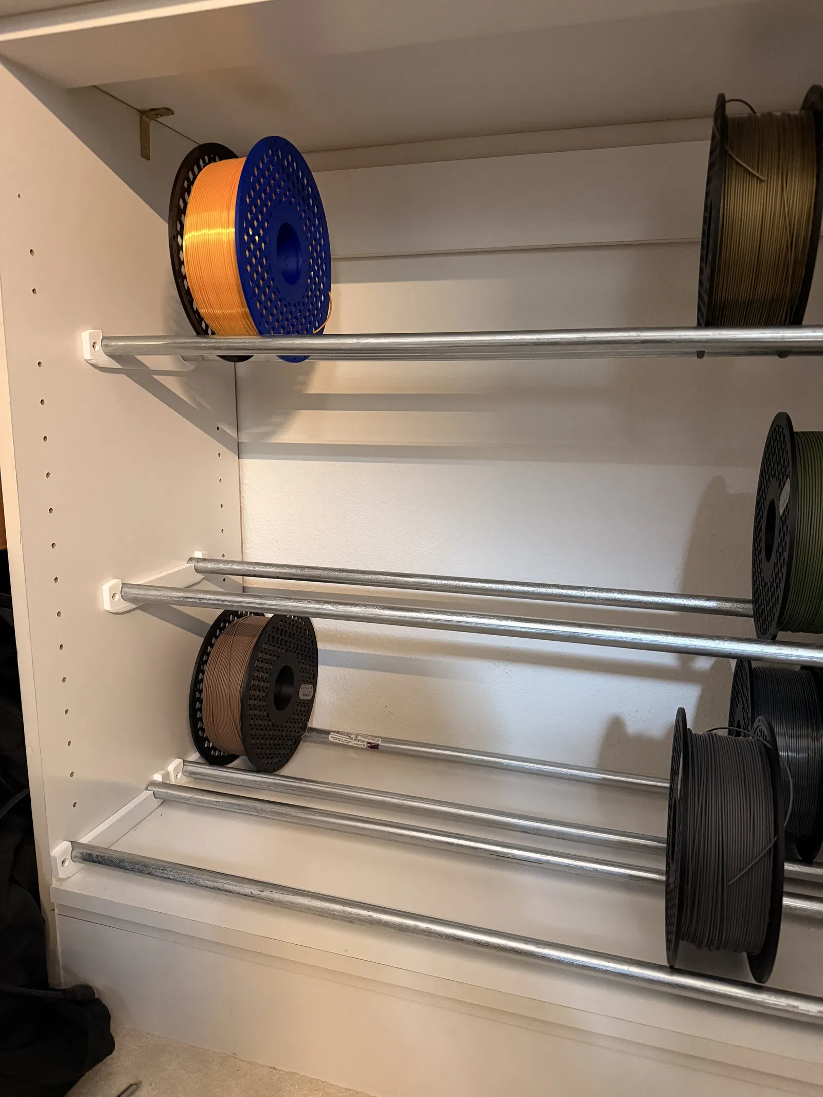 Mình có sẵn một kệ âm tủ trong closet và quyết định tận dụng để lưu trữ filament. Mình tìm thử nhưng không thấy bộ bracket treo spool nào phù hợp với không gian này, nên mình tự thiết kế cái này luôn. Các thanh rod là ống conduit kim loại 1/2" và lắp vừa khít vào các bracket này.