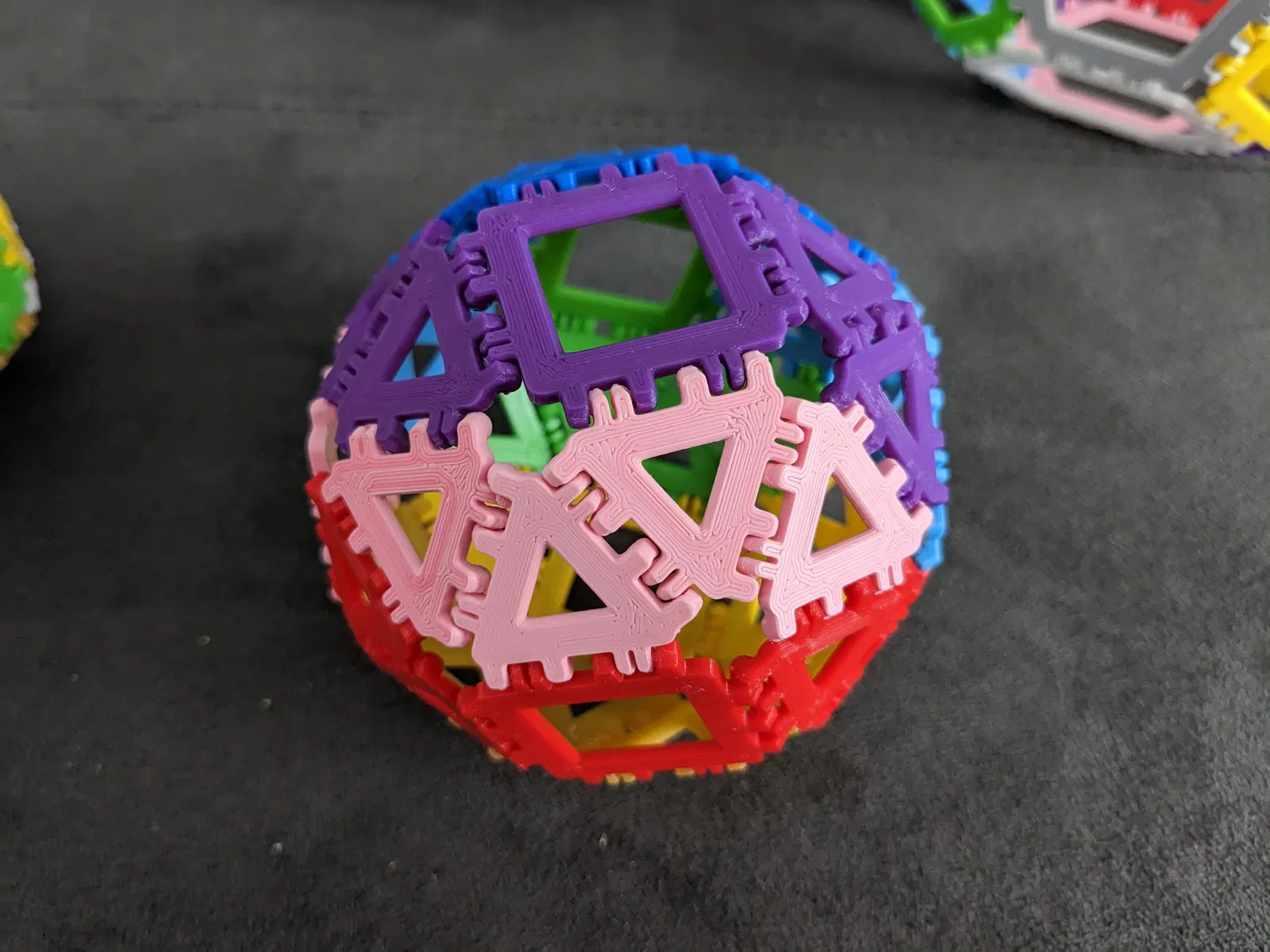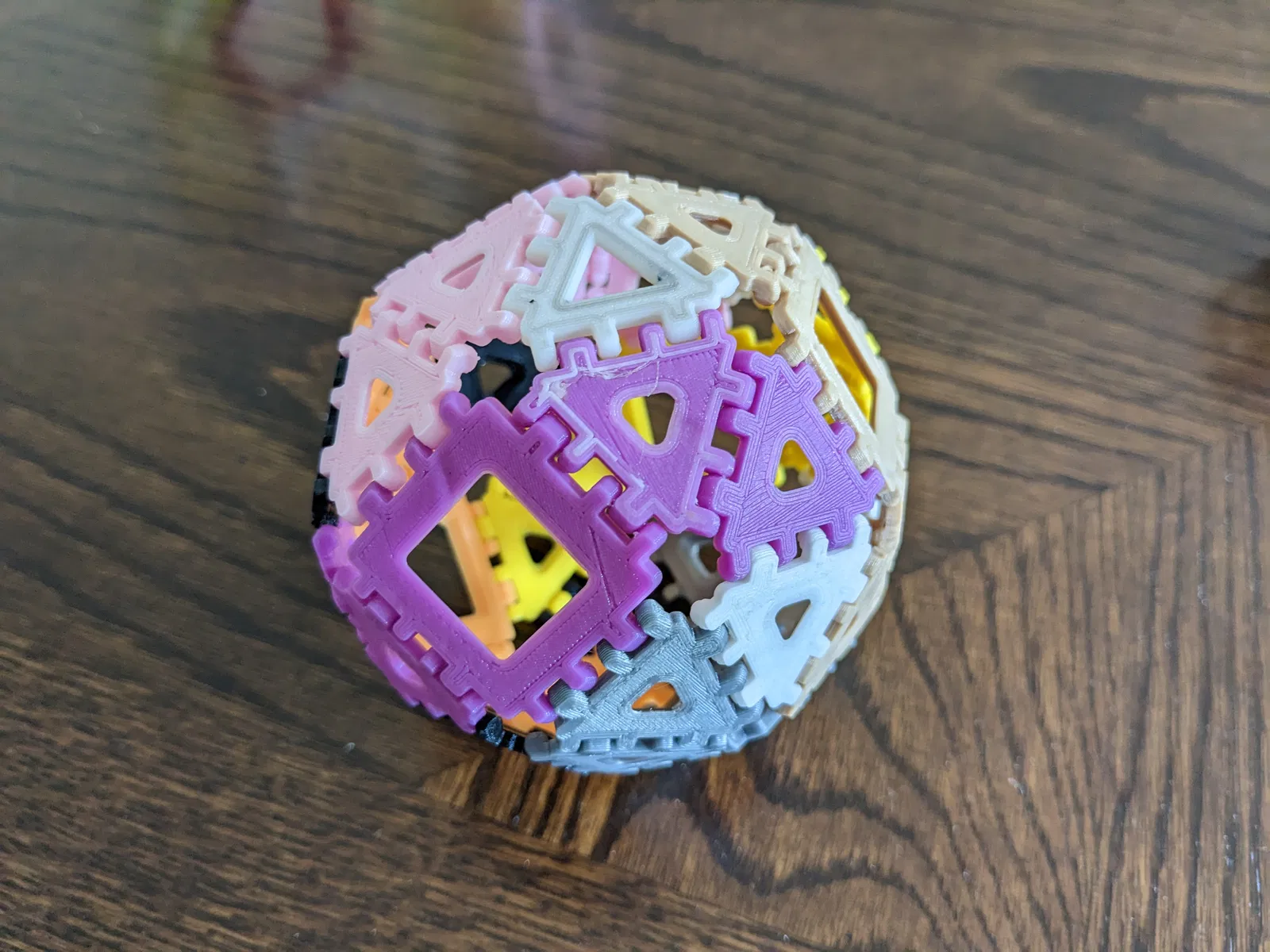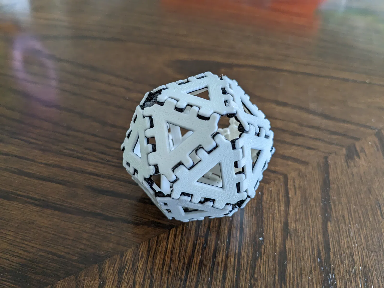 Thiết kế không cần support và tốn rất ít vật liệu. Tất cả các miếng trong hình bìa (4 khối đa diện) tổng cộng chỉ hết 128g filament. So với vài thiết kế tương tự, bản này có khoét rỗng ở giữa để dễ lắp ráp, và miếng chỉ cao bằng nửa khớp nối, giúp xoay các phần linh hoạt tối đa.