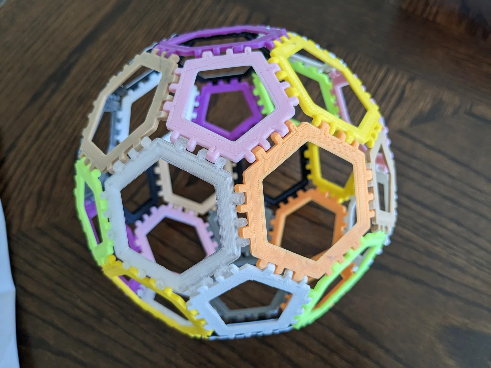 Bộ mảnh ghép để dựng các khối Archimedean/Johnson. In 0.1mm, không cần support, ít hao filament. Có file test và chỉnh “fudge factor” (ff) trong OpenSCAD để độ khít vừa ý, xoay linh hoạt, hợp cho trẻ em.