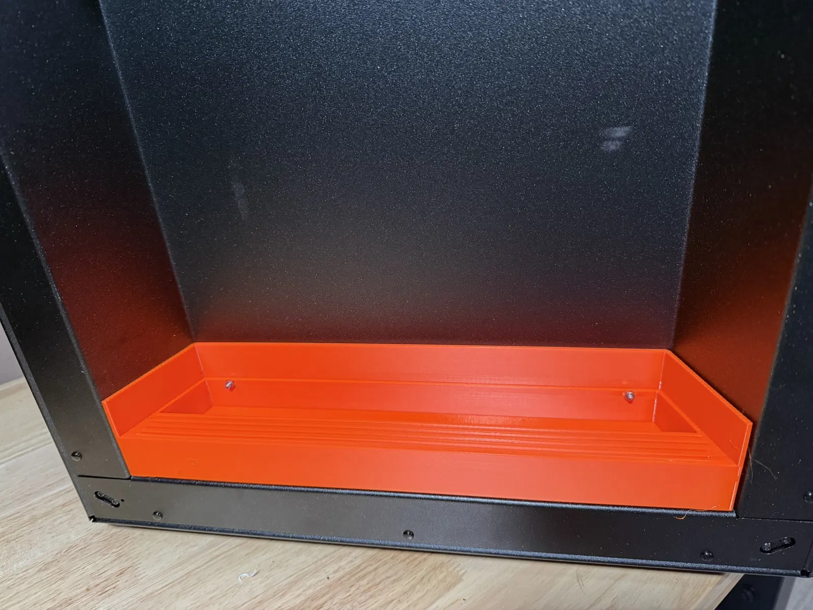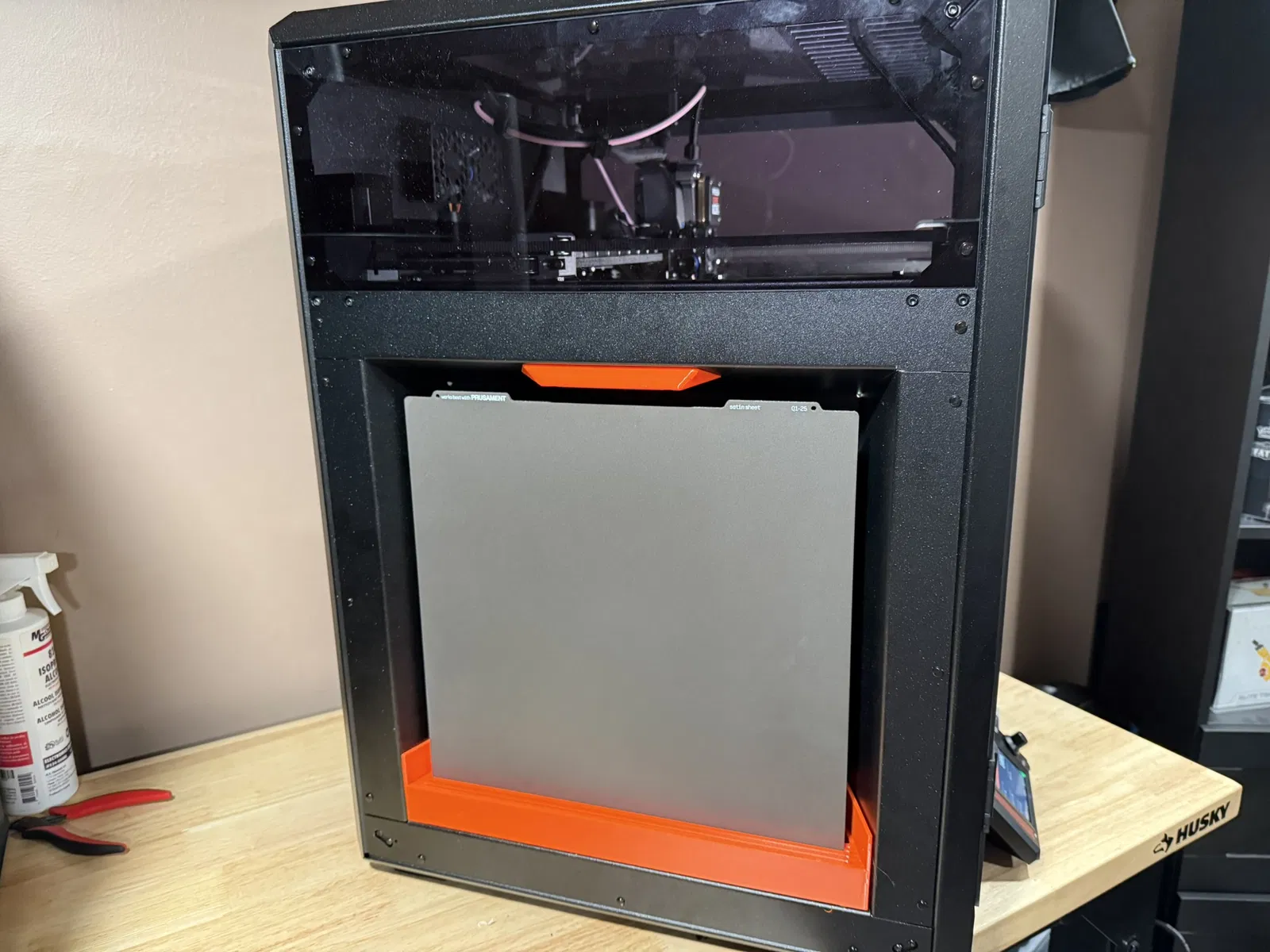 Mình không thấy mẫu nào fit chuẩn cho Core One L, nên tự thiết kế luôn! Cái build plate holder này dùng 2 lỗ dưới cùng trên panel bên trái để bắt cố định vào frame. Mình có để file slice ở dưới và đã in được mà không bị warpage, nhưng vẫn khuyên nên có ít nhất “mouse ears” ở mấy góc nhọn. Về dụng cụ, cái wrench Prusa đi kèm vặn vừa đai ốc M3. Do món này in khá lớn, mình khuyên chỉ dùng 2 perimeters. PLA chắc cũng xài ổn, nhưng mình in bằng PETG.